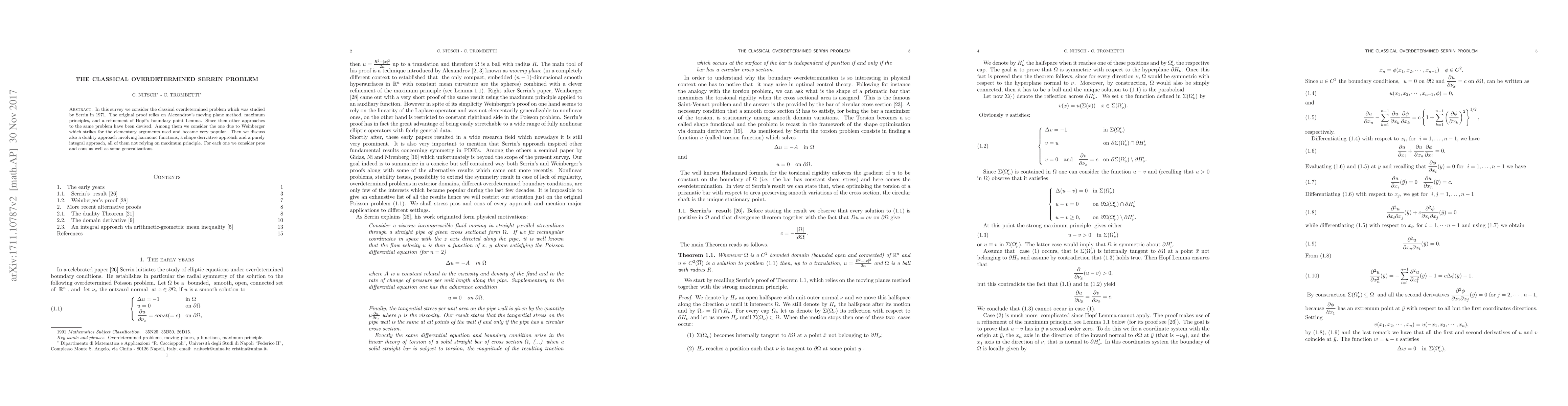In this survey we consider the classical overdetermined problem which was studied by Serrin in 1971. The original proof relies on Alexandrov's moving plane method, maximum principles, and a refinement of Hopf's boundary point Lemma. Since then other approaches to the same problem have been devised. Among them we consider the one due to Weinberger which strikes for the elementary arguments used and became very popular. Then we discuss also a duality approach involving harmonic functions, a shape derivative approach and a purely integral approach, all of them not relying on maximum principle. For each one we consider pros and cons as well as some generalizations.
