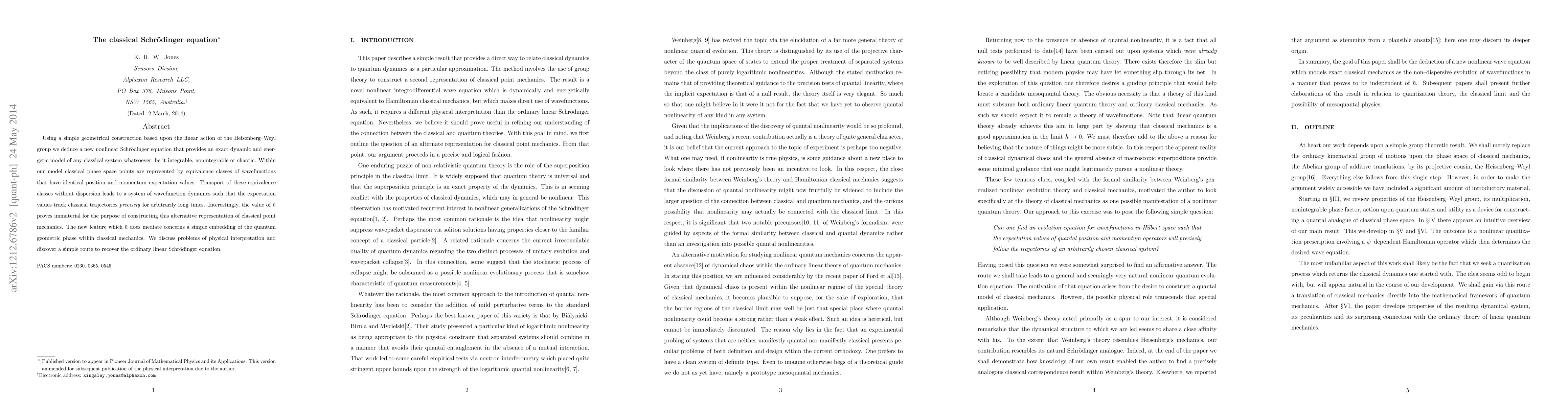The paper introduces a new nonlinear Schrödinger equation that models classical systems dynamically and energetically, providing an alternative representation of classical point mechanics independent of ħ's value.