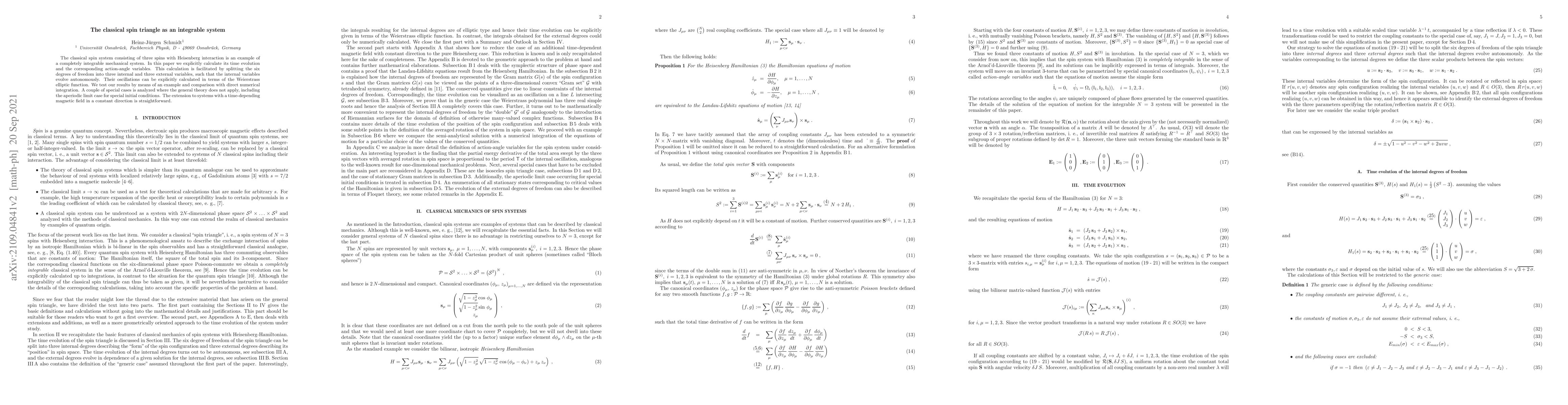 The classical spin system consisting of three spins with Heisenberg interaction is an example of a completely integrable mechanical system. In this paper we explicitly calculate its time evolution and the corresponding action-angle variables. This calculation is facilitated by splitting the six degrees of freedom into three internal and three external variables, such that the internal variables evolve autonomously. Their oscillations can be explicitly calculated in terms of the Weierstrass elliptic function. We test our results by means of an example and comparison with direct numerical integration. A couple of special cases is analyzed where the general theory does not apply, including the aperiodic limit case for special initial conditions. The extension to systems with a time-depending magnetic field in a constant direction is straightforward.