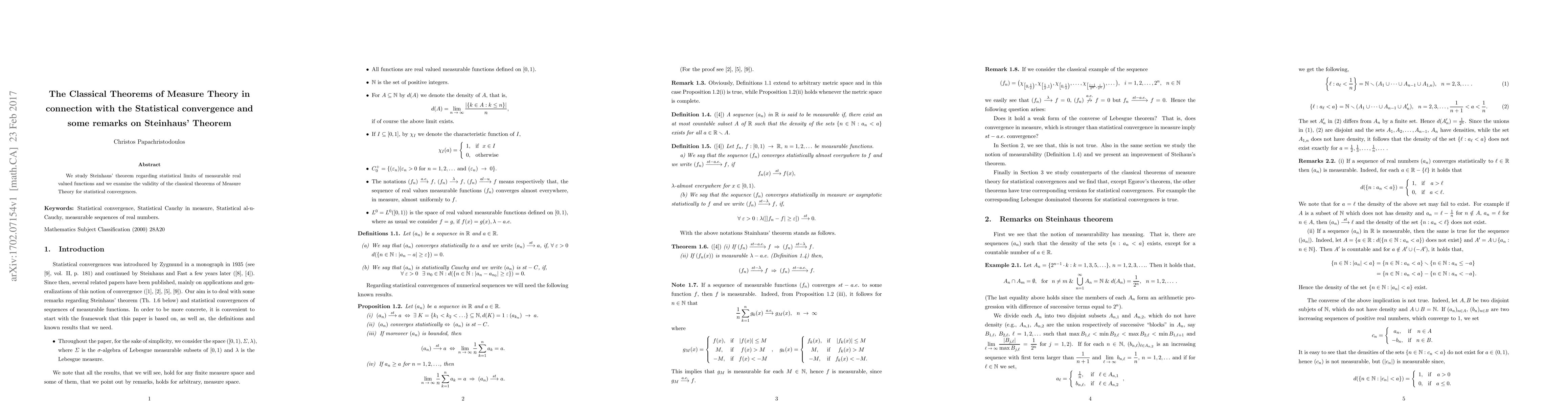 This paper studies Steinhaus' theorem on statistical limits of measurable functions and examines the applicability of classical measure theory theorems to statistical convergence.