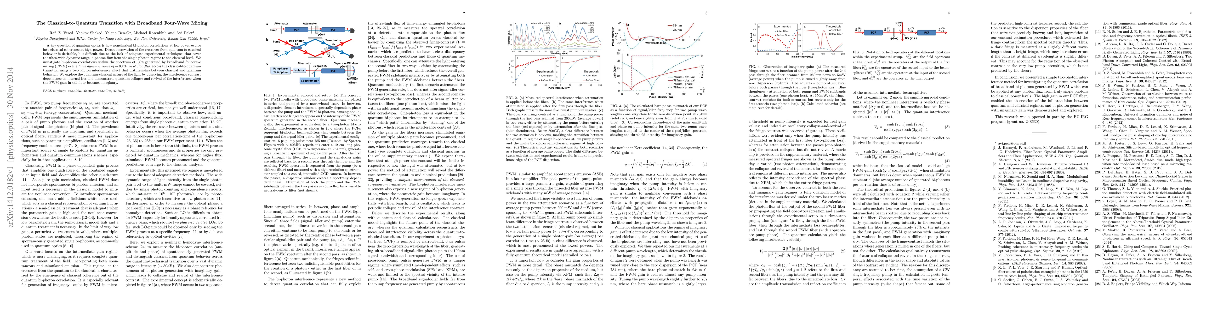 This paper investigates the transition from quantum to classical behavior in broadband four-wave mixing, observing bi-photon correlations over an 80dB dynamic range using two-photon interference. It demonstrates quantum collapse and revival of interference when the four-wave mixing gain becomes imaginary.