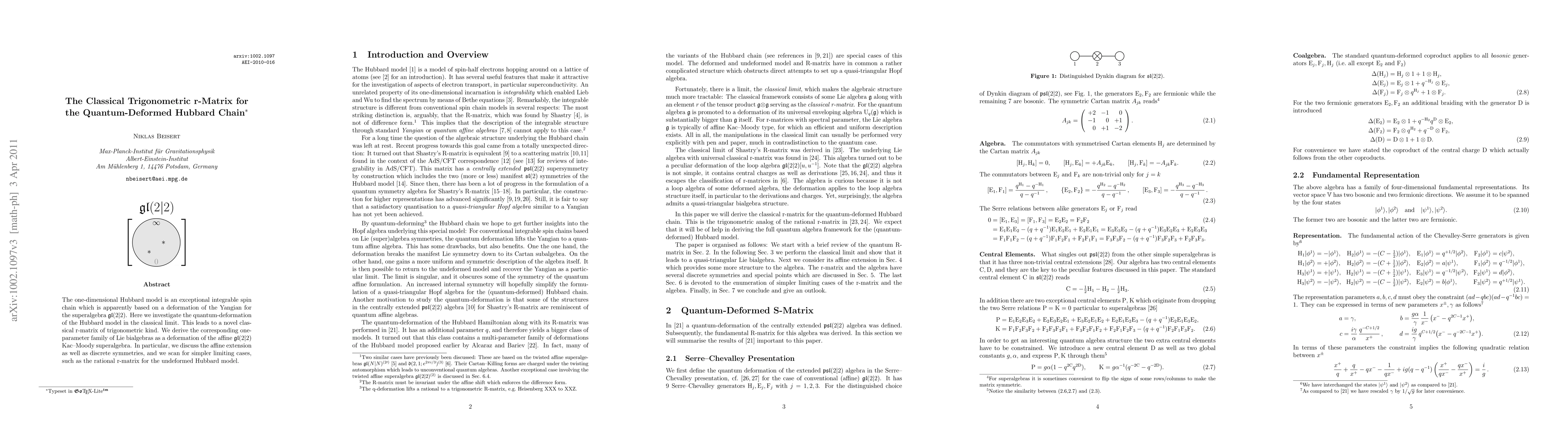 This paper explores the classical limit of the quantum-deformed one-dimensional Hubbard model, deriving a novel trigonometric r-matrix and a corresponding one-parameter family of Lie bialgebras as a deformation of the affine gl(2|2) Kac-Moody superalgebra. It also discusses the affine extension, discrete symmetries, and simpler limiting cases like the rational r-matrix for the undeformed Hubbard model.