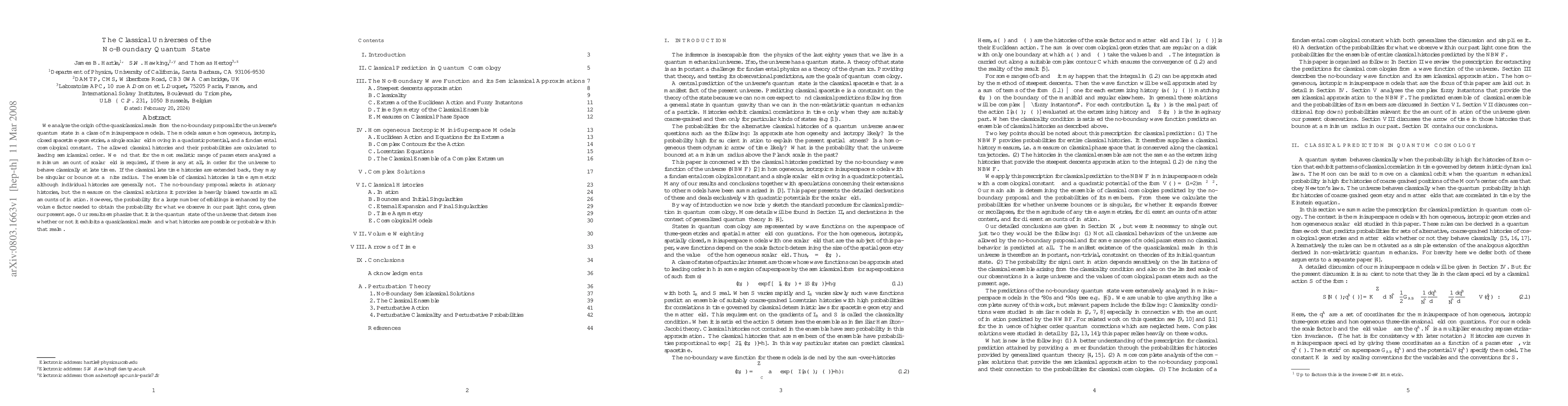 This paper explores the emergence of classical universes from the no-boundary quantum state proposal, finding that a minimal amount of scalar field is required for late-time classical behavior. The no-boundary proposal favors inflationary histories, though it heavily biases towards small inflation amounts, with large e-foldings enhanced by the probability volume factor.