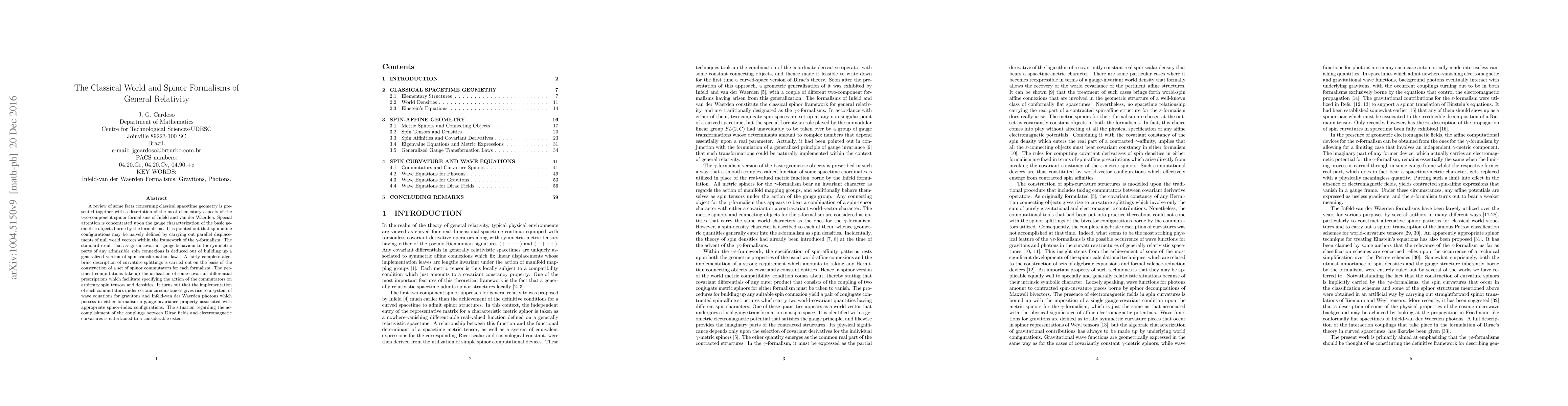 A review of some facts concerning classical spacetime geometry is presented together with a description of the most elementary aspects of the two-component spinor formalisms of Infeld and van der Waerden. Special attention is concentrated upon the gauge characterization of the basic geometric objects borne by the formalisms. It is pointed out that spin-affine configurations are most naively defined by carrying out parallel displacements of null world vectors within the framework of the {\gamma}-formalism. The standard result that assigns a covariant gauge behaviour to the symmetric parts of any admissible spin connexions is deduced out of building up a generalized version of spin transformation laws. A fairly complete algebraic description of curvature splittings is carried out on the basis of the construction of a set of spinor commutators for each formalism. The pertinent computations take up the utilization of some covariant differential prescriptions which facilitate specifying the action of the commutators on arbitrary spin tensors and densities. It turns out that the implementation of such commutators under certain circumstances gives rise to a system of wave equations for gravitons and Infeld-van der Waerden photons which possess in either formalism a gauge-invariance property associated with appropriate spinor-index configurations. The situation regarding the accomplishment of the couplings between Dirac fields and electromagnetic curvatures is entertained to a considerable extent.