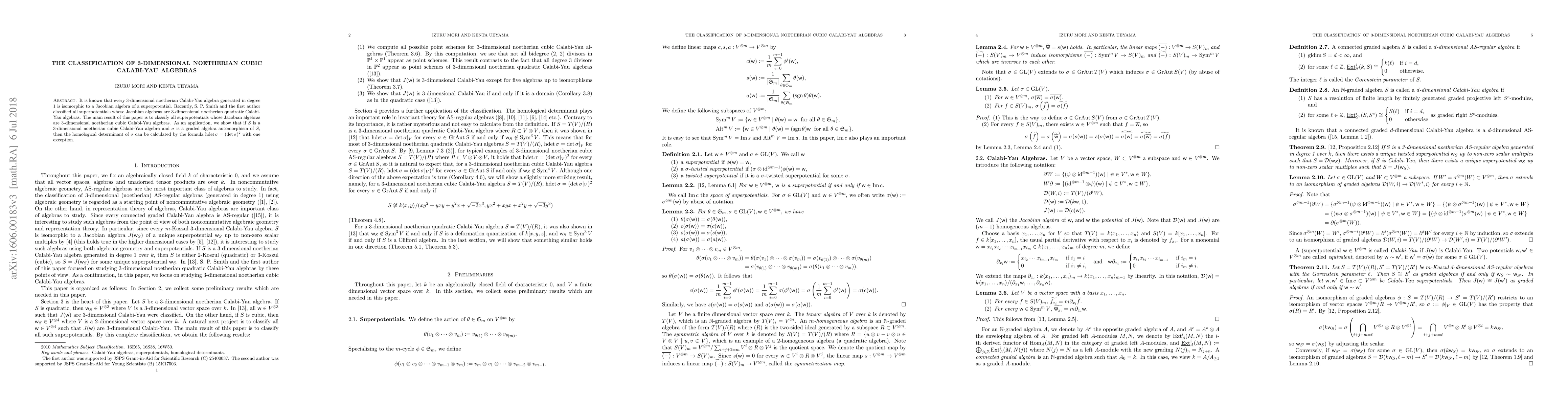 This paper classifies all superpotentials generating 3-dimensional noetherian cubic Calabi-Yau algebras via Jacobian algebras, extending previous work on quadratic cases. It also provides a formula for calculating the homological determinant of graded algebra automorphisms of such algebras.