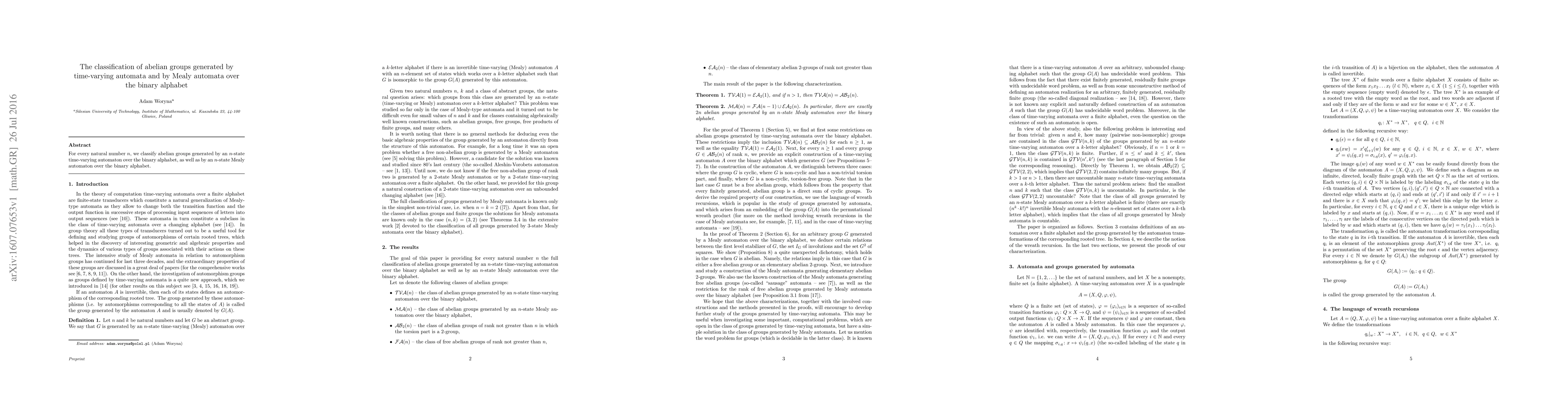 For every natural number $n$, we classify abelian groups generated by an $n$-state time-varying automaton over the binary alphabet, as well as by an $n$-state Mealy automaton over the binary alphabet.