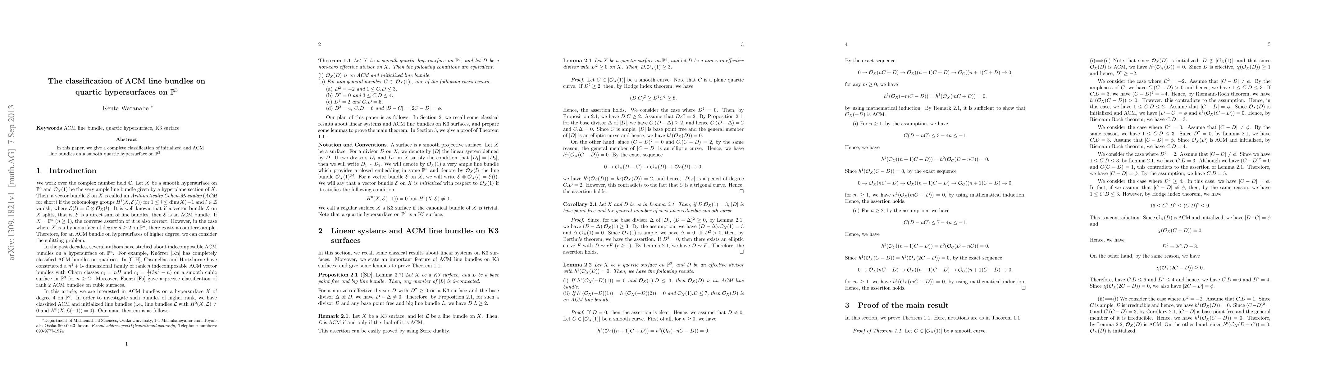 Summary: This paper provides a comprehensive classification of initialized and ACM line bundles on smooth quartic hypersurfaces embedded in projective three-space. The results contribute to the understanding of the geometric and algebraic properties of these bundles.