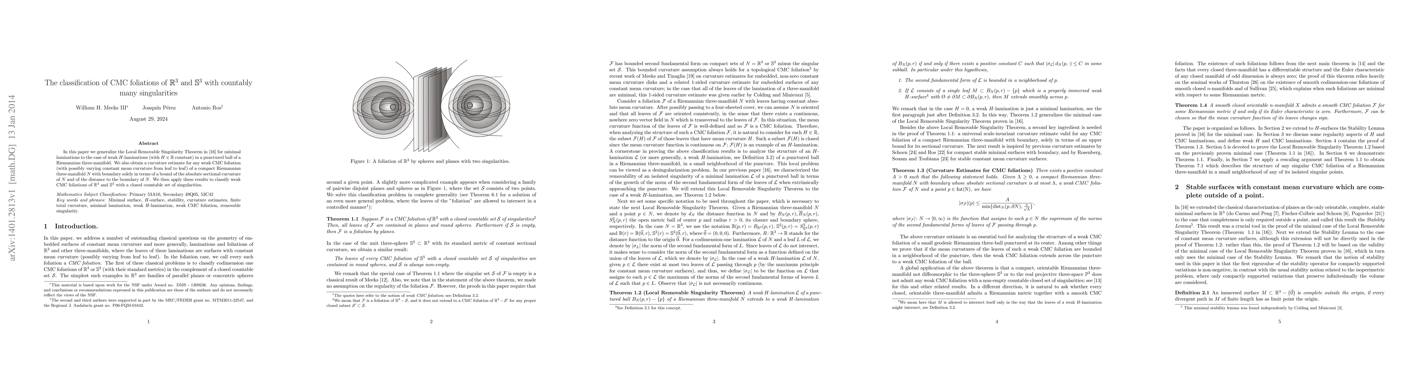 In this paper we generalize the Local Removable Singularity Theorem in [16] for minimal laminations to the case of weak $H$-laminations (with $H\in \mathbb{R}$ constant) in a punctured ball of a Riemannian three-manifold. We also obtain a curvature estimate for any weak CMC foliation (with possibly varying constant mean curvature from leaf to leaf) of a compact Riemannian three-manifold $N$ with boundary solely in terms of a bound of the absolute sectional curvature of $N$ and of the distance to the boundary of $N$. We then apply these results to classify weak CMC foliations of $\mathbb{R}^3$ and $\mathbb{S}^3$ with a closed countable set of singularities.
