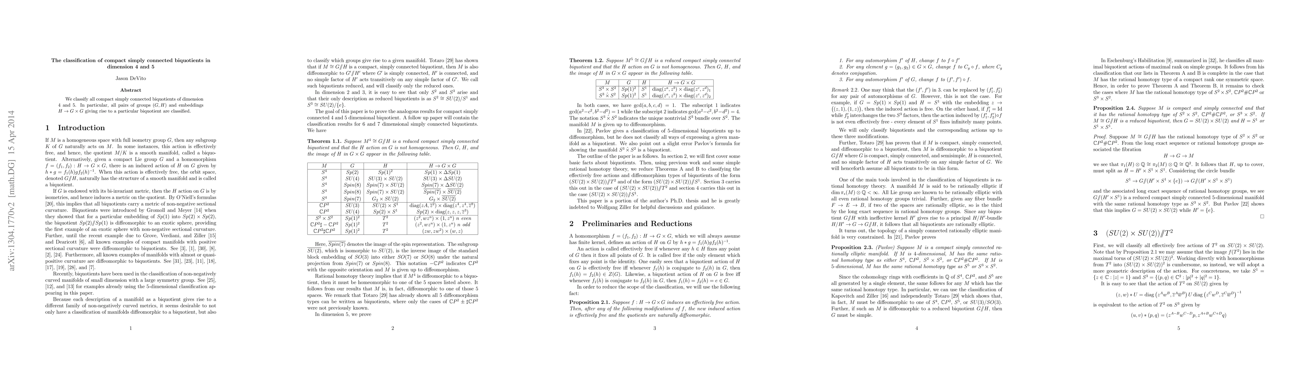 We classify all compact simply connected biquotients of dimension 4 and 5. In particular, all pairs of groups $(G,H)$ and embeddings $H\rightarrow G\times G$ giving rise to a particular biquotient are classified.