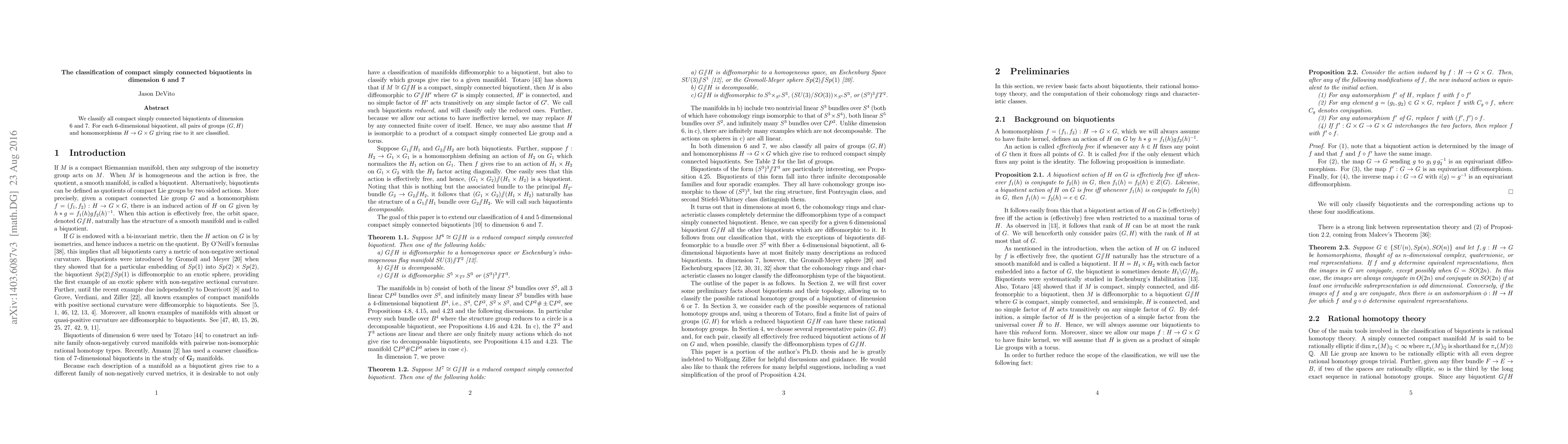 We classify all compact simply connected biquotients of dimension 6 and 7. For each $6$-dimensional biquotient, all pairs of groups $(G,H)$ and homomorphisms $H\rightarrow G\times G$ giving rise to it are classified.