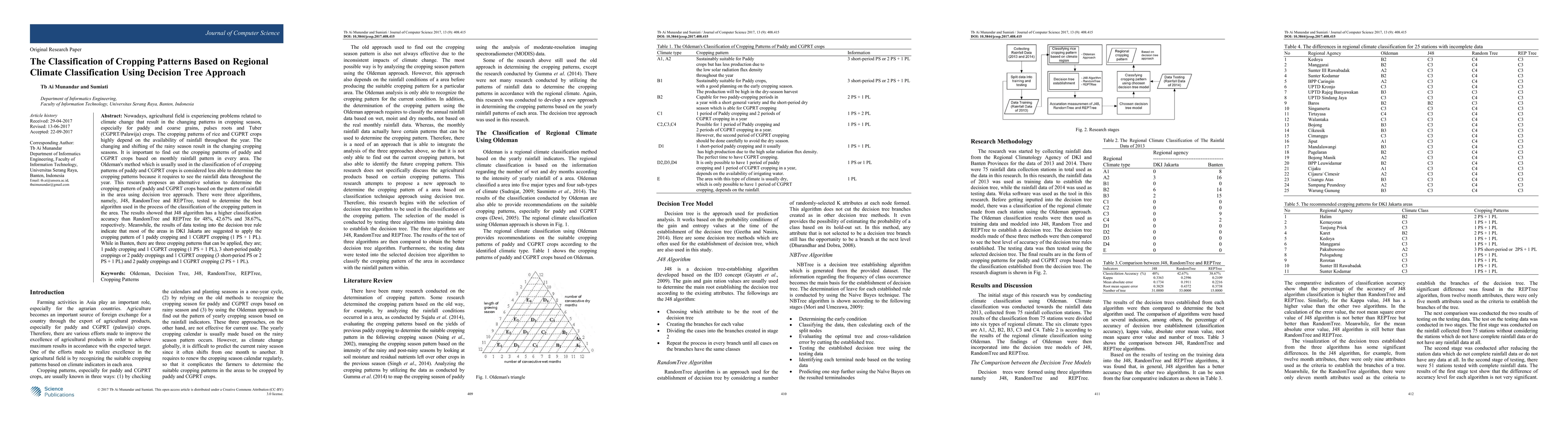 This paper proposes a decision tree approach for classifying cropping patterns based on regional climate, specifically focusing on paddy and CGPRT crops. The J48 algorithm demonstrated the highest classification accuracy among tested methods, suggesting optimal cropping patterns for areas like DKI Jakarta and Banten based on local rainfall patterns.