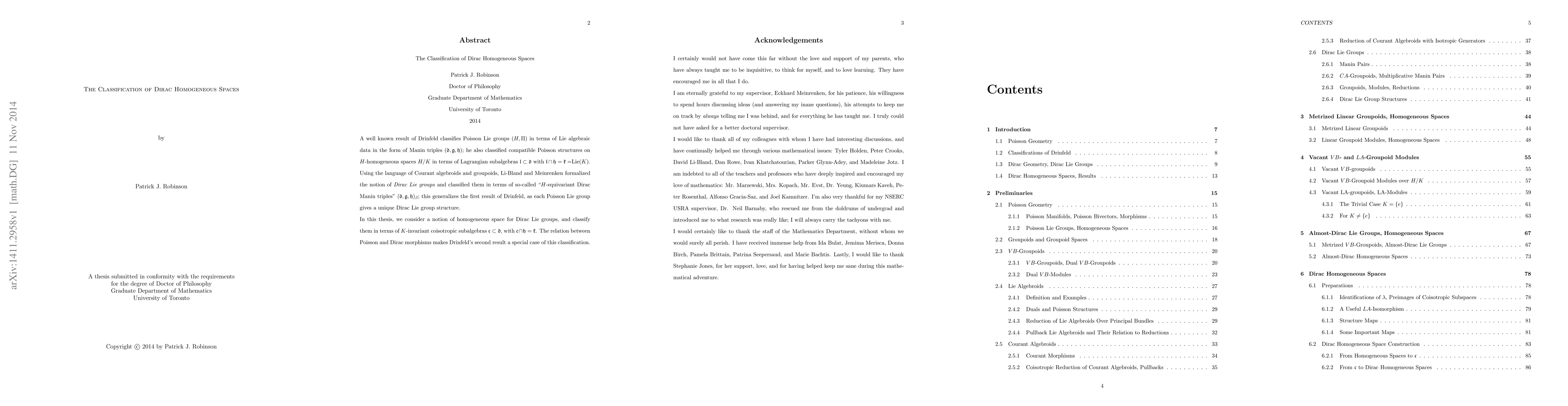 A well known result of Drinfeld classifies Poisson Lie groups $(H,\Pi)$ in terms of Lie algebraic data in the form of Manin triples $(\mathfrak{d},\mathfrak{g},\mathfrak{h})$; he also classified compatible Poisson structures on $H$-homogeneous spaces $H/K$ in terms of Lagrangian subalgebras $\mathfrak{l}\subset\mathfrak{d}$ with $\mathfrak{l}\cap\mathfrak{h}=\mathfrak{k}=\mathrm{Lie}(K)$. Using the language of Courant algebroids and groupoids, Li-Bland and Meinrenken formalized the notion of \emph{Dirac Lie groups} and classified them in terms of so-called "$H$-equivariant Dirac Manin triples" $(\mathfrak{d}, \mathfrak{g}, \mathfrak{h})_\beta$; this generalizes the first result of Drinfeld, as each Poisson Lie group gives a unique Dirac Lie group structure. In this thesis, we consider a notion of homogeneous space for Dirac Lie groups, and classify them in terms of $K$-invariant coisotropic subalgebras $\mathfrak{c}\subset\mathfrak{d}$, with $\mathfrak{c}\cap\mathfrak{h} = \mathfrak{k}$. The relation between Poisson and Dirac morphisms makes Drinfeld's second result a special case of this classification.