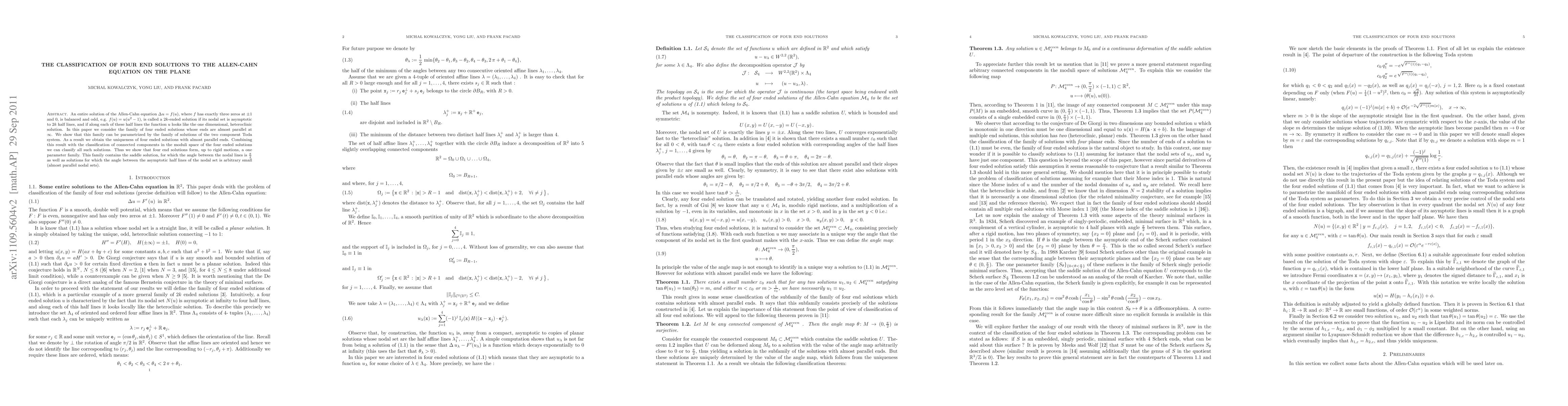 An entire solution of the Allen-Cahn equation $\Delta u=f(u)$, where $f$ has exactly three zeros at $\pm 1$ and 0, is balanced and odd, e.g. $f(u)=u(u^2-1)$, is called a $2k$-ended solution if its nodal set is asymptotic to $2k$ half lines, and if along each of these half lines the function $u$ looks like the one dimensional, heteroclinic solution. In this paper we consider the family of four ended solutions whose ends are almost parallel at $\infty$. We show that this family can be parametrized by the family of solutions of the two component Toda system. As a result we obtain the uniqueness of four ended solutions with almost parallel ends. Combining this result with the classification of connected components in the moduli space of the four ended solutions we can classify all such solutions. Thus we show that four end solutions form, up to rigid motions, a one parameter family. This family contains the saddle solution, for which the angle between the nodal lines is $\frac{\pi}{2}$ as well as solutions for which the angle between the asymptotic half lines of the nodal set is arbitrary small (almost parallel nodal sets).