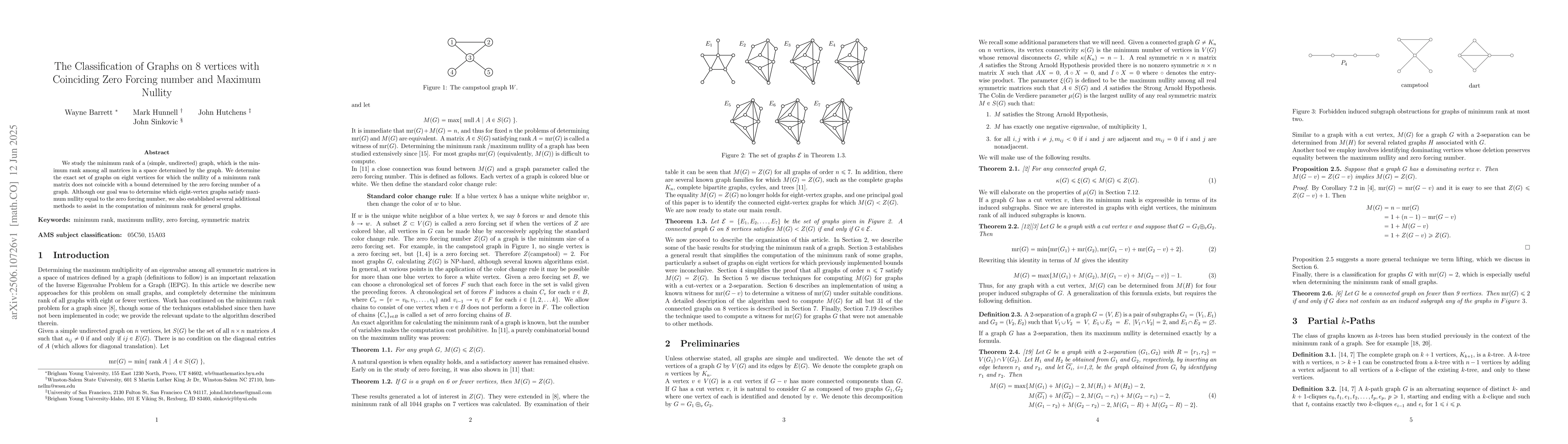We study the minimum rank of a (simple, undirected) graph, which is the minimum rank among all matrices in a space determined by the graph. We determine the exact set of graphs on eight vertices for which the nullity of a minimum rank matrix does not coincide with a bound determined by the zero forcing number of a graph. Although our goal was to determine which eight-vertex graphs satisfy maximum nullity equal to the zero forcing number, we also established several additional methods to assist in the computation of minimum rank for general graphs.