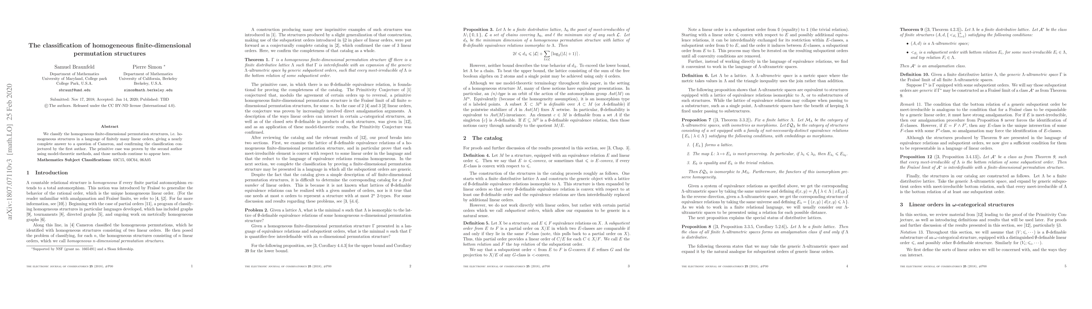 This paper classifies homogeneous finite-dimensional permutation structures, confirming a conjecture and addressing a question posed by Cameron, utilizing model-theoretic methods developed by the authors. The classification completes the nearly full answer to the problem.
