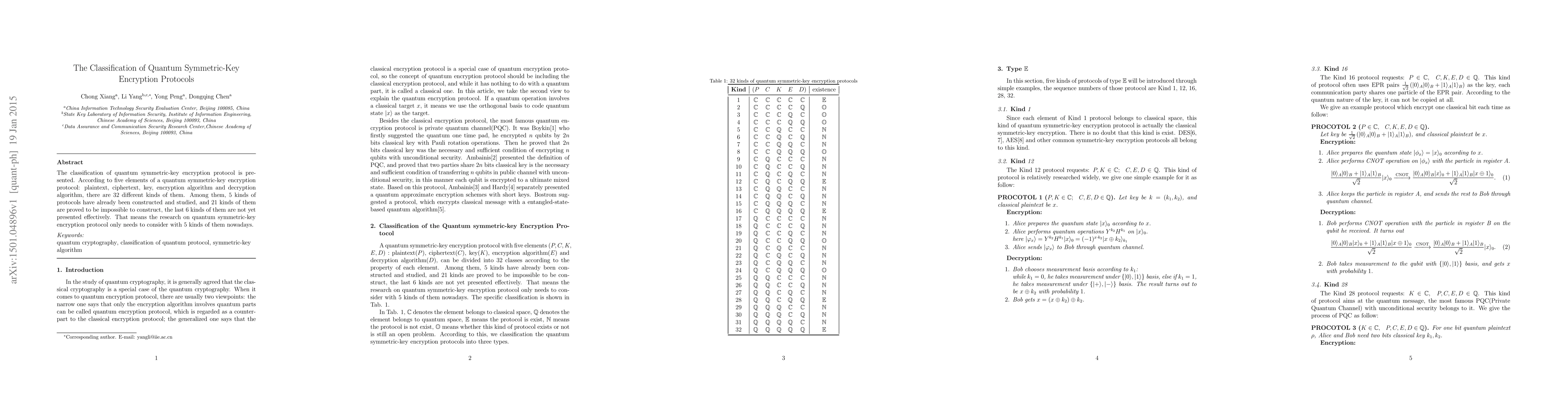 This paper classifies quantum symmetric-key encryption protocols based on five elements: plaintext, ciphertext, key, encryption algorithm, and decryption algorithm. It identifies 32 possible protocols, with 5 constructed, 21 proven impossible, and 6 yet to be effectively presented. Current research should focus on the 5 feasible protocols.