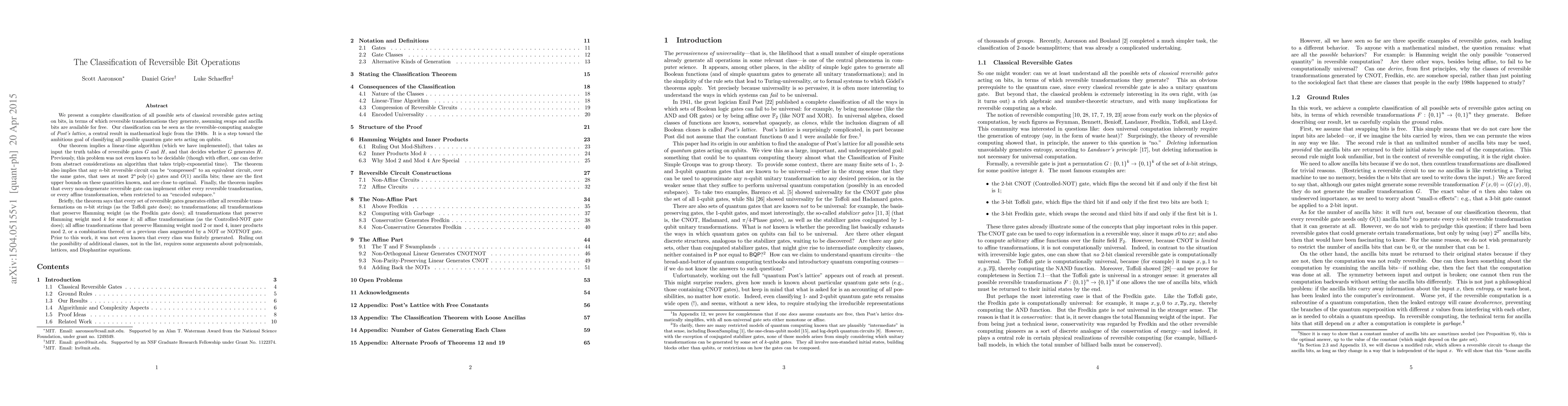 This paper classifies all possible sets of reversible bit operations, establishing a framework analogous to Post's lattice in mathematical logic. It provides a linear-time algorithm to determine whether one reversible gate generates another, and establishes upper bounds on circuit gate counts and ancilla bits, revealing that reversible gates generate either all transformations, specific subsets, or affine transformations.