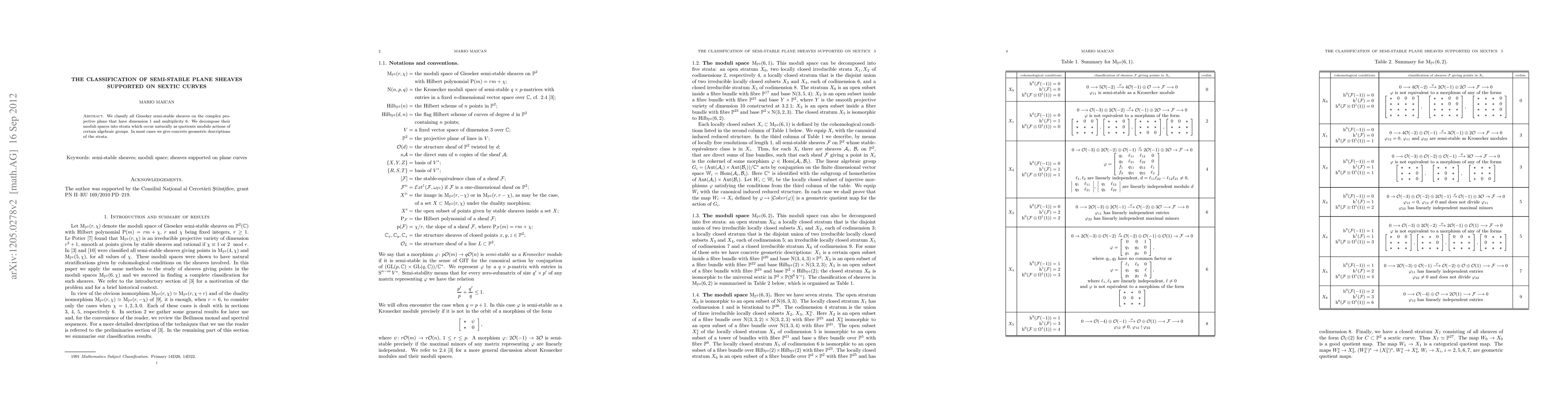 We classify all Gieseker semi-stable sheaves on the complex projective plane that have dimension 1 and multiplicity 6. We decompose their moduli spaces into strata which occur naturally as quotients modulo actions of certain algebraic groups. In most cases we give concrete geometric descriptions of the strata.