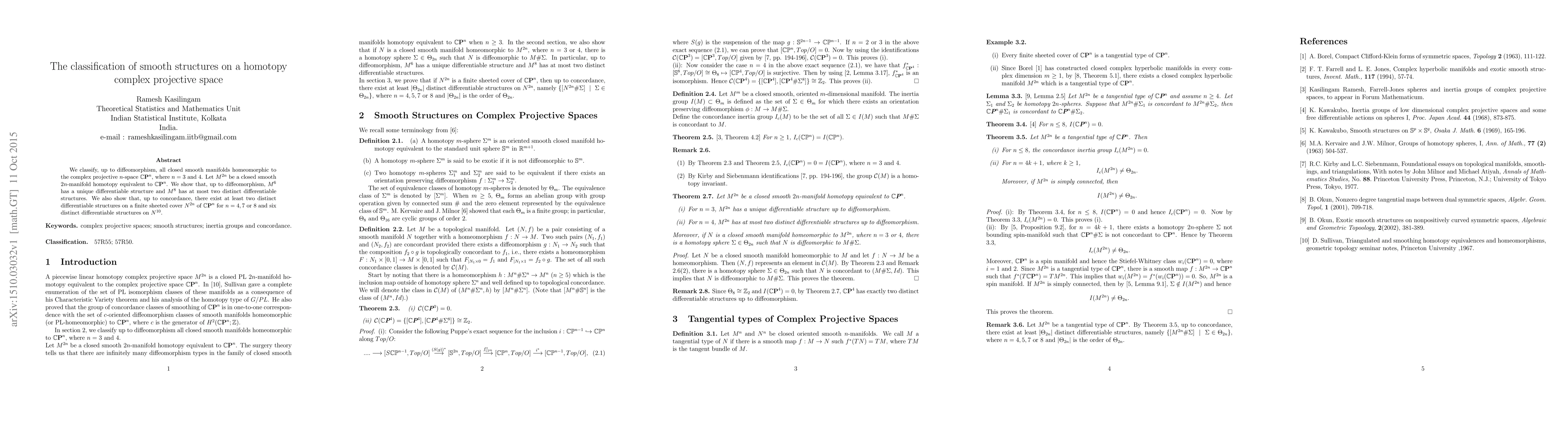 This paper classifies the smooth structures on closed smooth manifolds homotopy equivalent to complex projective spaces $\mathbb{C}\textbf{P}^n$ for $n=3$ and $4$. It finds that $M^6$ has a unique differentiable structure, while $M^8$ has at most two, and explores the existence of multiple differentiable structures on finite sheeted covers for higher dimensions.