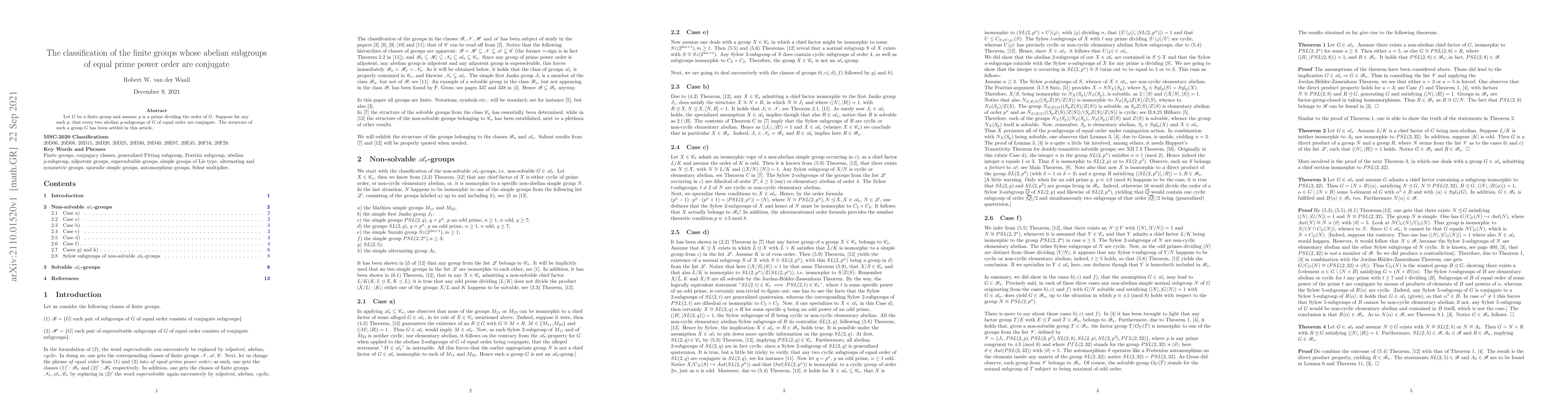 This paper determines the structure of finite groups where abelian subgroups of equal prime power order are conjugate, providing a comprehensive classification.