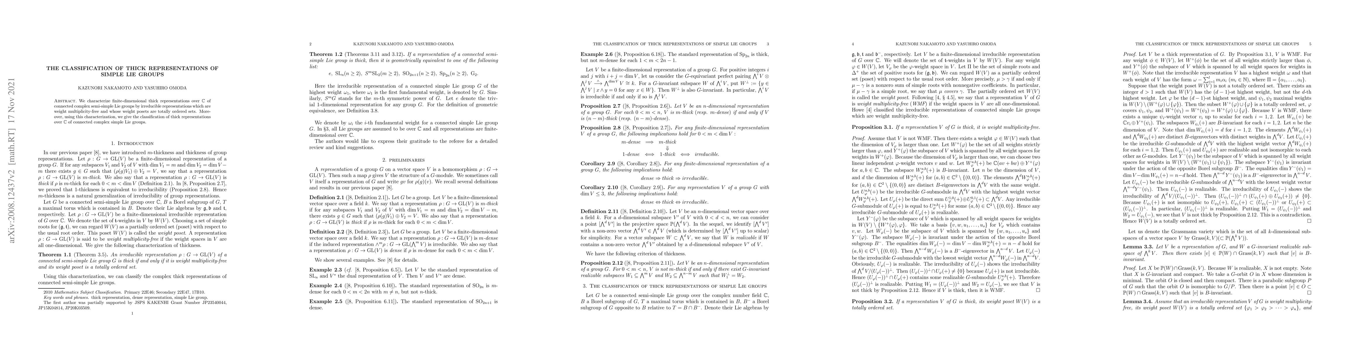 This paper classifies finite-dimensional thick representations of connected complex semi-simple Lie groups, identifying them as irreducible, weight multiplicity-free representations with totally ordered weight posets. It also provides a comprehensive classification of such representations for connected complex simple Lie groups.