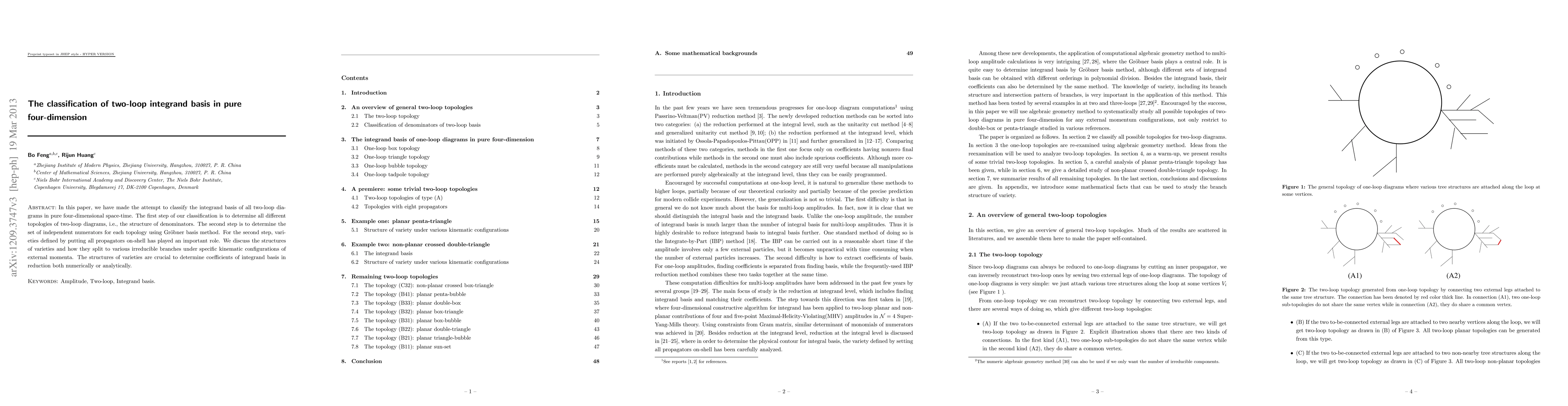 In this paper, we have made the attempt to classify the integrand basis of all two-loop diagrams in pure four-dimension space-time. Our classification includes the topology of two-loop diagrams which determines the structure of denominators, and the set of numerators under different kinematic configurations of external momenta by using Gr\"{o}bner basis method. In our study, the variety defined by setting all propagators to on-shell has played an important role. We discuss the structure of variety and how it splits to various irreducible branches when external momenta at each corner of diagrams satisfy some special kinematic conditions. This information is crucial to the numerical or analytical fitting of coefficients for integrand basis in reduction process.