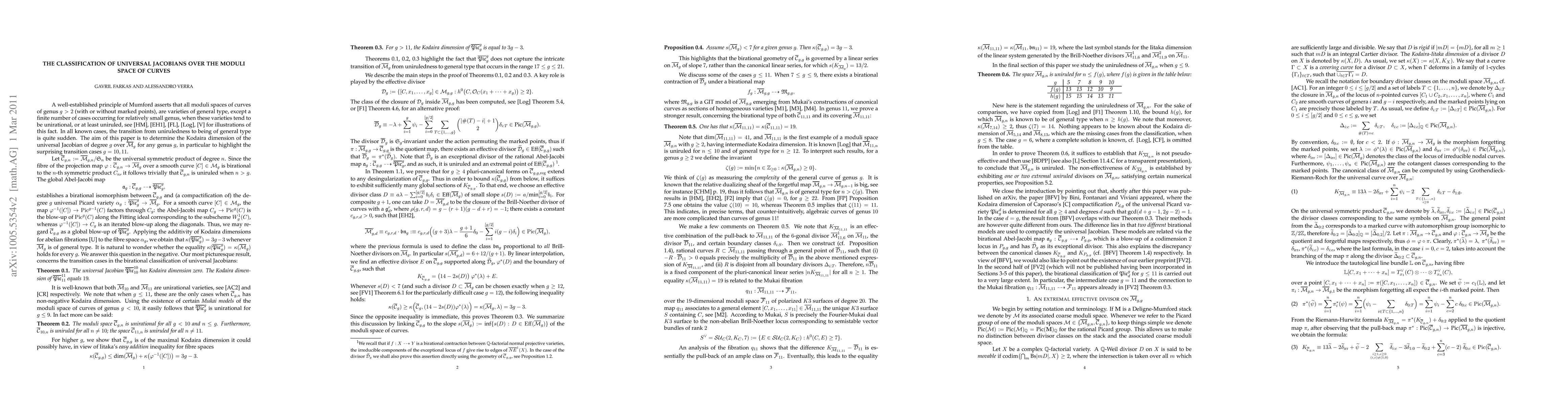 This paper provides a complete birational classification of the degree g universal Jacobian P_g over the moduli space of curves, showing that P_g has Kodaira dimension zero for g=10 and 19 for g=11, while for g>11 it has Kodaira dimension 3g-3, disproving the assumption that P_g and M_g share the same Kodaira dimension across all genera.