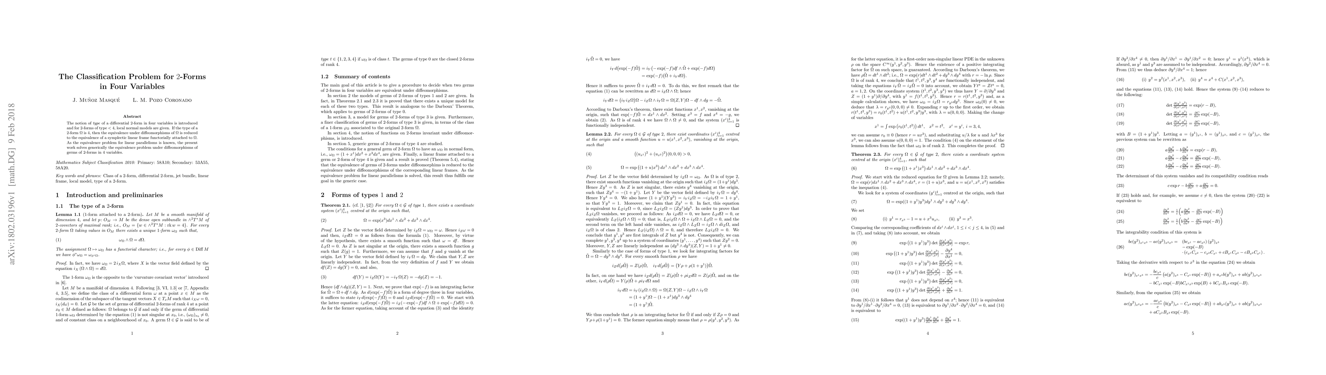 The notion of type of a differential 2-form in four variables is introduced and for 2-forms of type < 4, local normal models are given. If the type of a 2-form $\Omega$ is 4, then the equivalence under diffeomorphisms of $\Omega$ is reduced to the equivalence of a symplectic linear frame functorially attached to $\Omega$. As the equivalence problem for linear parallelisms is known, the present work solves generically the equivalence problem under diffeomorphisms of germs of 2-forms in 4 variables.