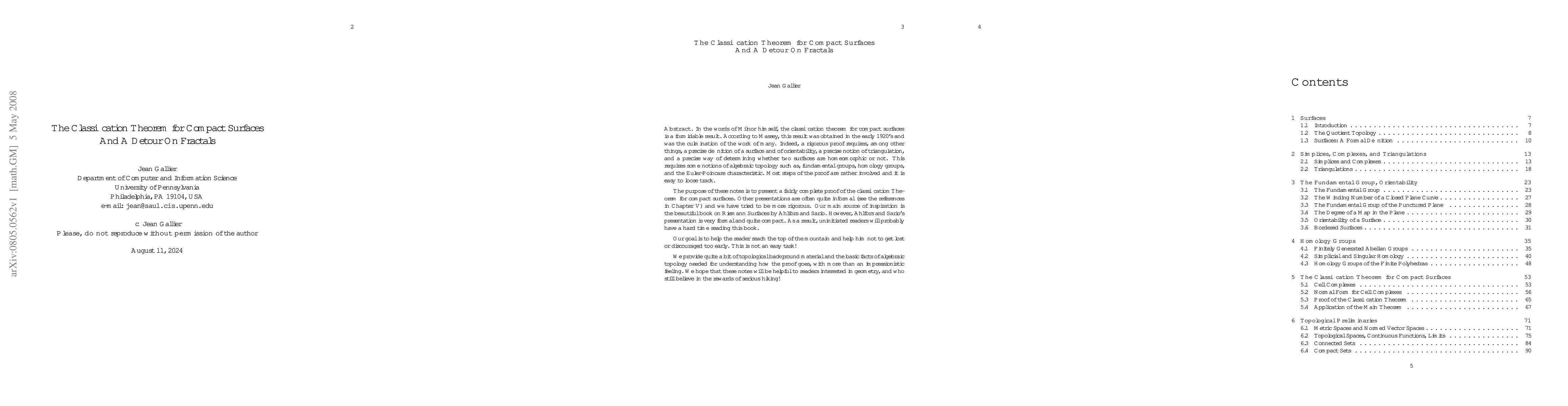 The purpose of these notes is to present a fairly complete proof of the classification Theorem for compact surfaces. Other presentations are often quite informal (see the references in Chapter V) and we have tried to be more rigorous. Our main source of inspiration is the beautiful book on Riemann Surfaces by Ahlfors and Sario. However, Ahlfors and Sario's presentation is very formal and quite compact. As a result, uninitiated readers will probably have a hard time reading this book. Our goal is to help the reader reach the top of the mountain and help him not to get lost or discouraged too early. This is not an easy task! We provide quite a bit of topological background material and the basic facts of algebraic topology needed for understanding how the proof goes, with more than an impressionistic feeling. We hope that these notes will be helpful to readers interested in geometry, and who still believe in the rewards of serious hiking!