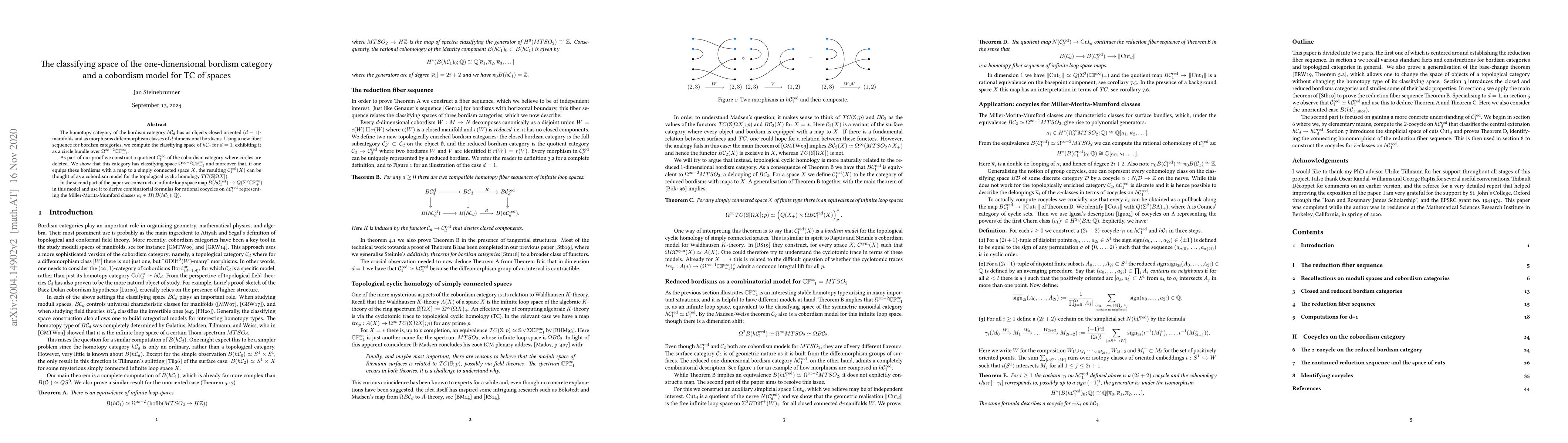 The homotopy category of the bordism category $hBord_d$ has as objects closed oriented $(d-1)$-manifolds and as morphisms diffeomorphism classes of $d$-dimensional bordisms. Using a new fiber sequence for bordism categories, we compute the classifying space of $hBord_d$ for $d = 1$, exhibiting it as a circle bundle over $\mathbb{CP}^\infty_{-1}$. As part of our proof we construct a quotient $Bord_1^{red}$ of the cobordism category where circles are deleted. We show that this category has classifying space $\Omega^{\infty-2}\mathbb{CP}^\infty_{-1}$ and moreover that, if one equips these bordisms with a map to a simply connected space $X$, the resulting $Bord_1^{red}(X)$ can be thought of as a cobordism model for the topological cyclic homology $TC(\mathbb{S}[\Omega X])$. In the second part of the paper we construct an infinite loop space map $B(hBord_1^{red}) \to Q(\Sigma^2 \mathbb{CP}^\infty_+)$ in this model and use it to derive combinatorial formulas for rational cocycles on $Bord_1^{red}$ representing the Miller-Morita-Mumford classes $\kappa_i \in H^{2i+2}((B(hBord_1); \mathbb{Q})$.