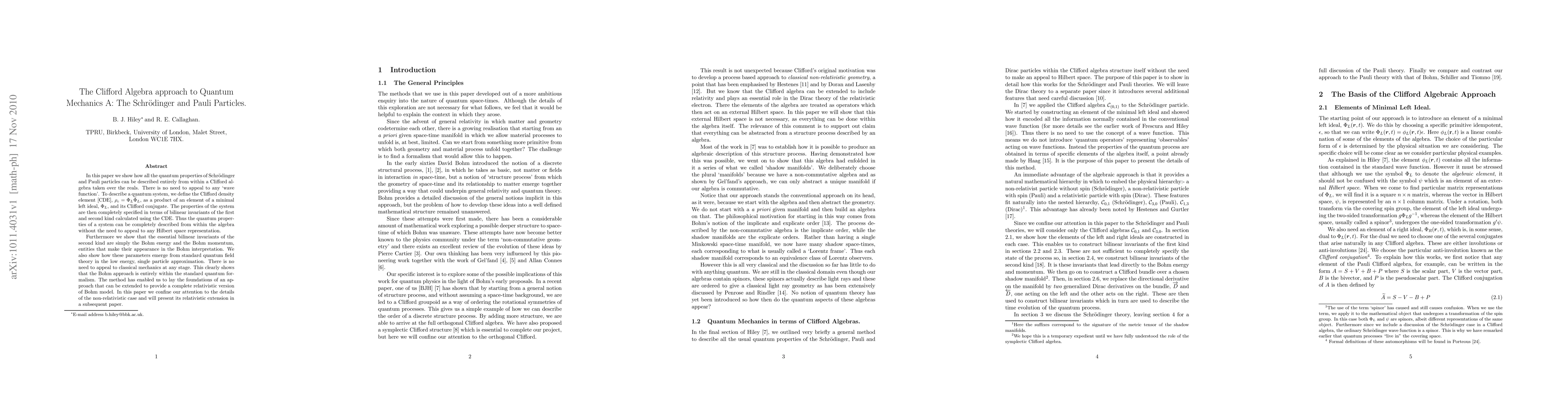 In this paper we show how all the quantum properties of Schroedinger and Pauli particles can be described entirely from within a Clifford algebra taken over the reals. There is no need to appeal to any `wave function'. To describe a quantum system, we define the Clifford density element [CDE] as a product of an element of a minimal left ideal and its Clifford conjugate. The properties of the system are then completely specified in terms of bilinear invariants of the first and second kind calculated using the CDE. Thus the quantum properties of a system can be completely described from within the algebra without the need to appeal to any Hilbert space representation. Furthermore we show that the essential bilinear invariants of the second kind are simply the Bohm energy and the Bohm momentum, entities that make their appearance in the Bohm interpretation. We also show how these parameters emerge from standard quantum field theory in the low energy, single particle approximation. There is no need to appeal to classical mechanics at any stage. This clearly shows that the Bohm approach is entirely within the standard quantum formalism. The method has enabled us to lay the foundations of an approach that can be extended to provide a complete relativistic version of Bohm model. In this paper we confine our attention to the details of the non-relativistic case and will present its relativistic extension in a subsequent paper.