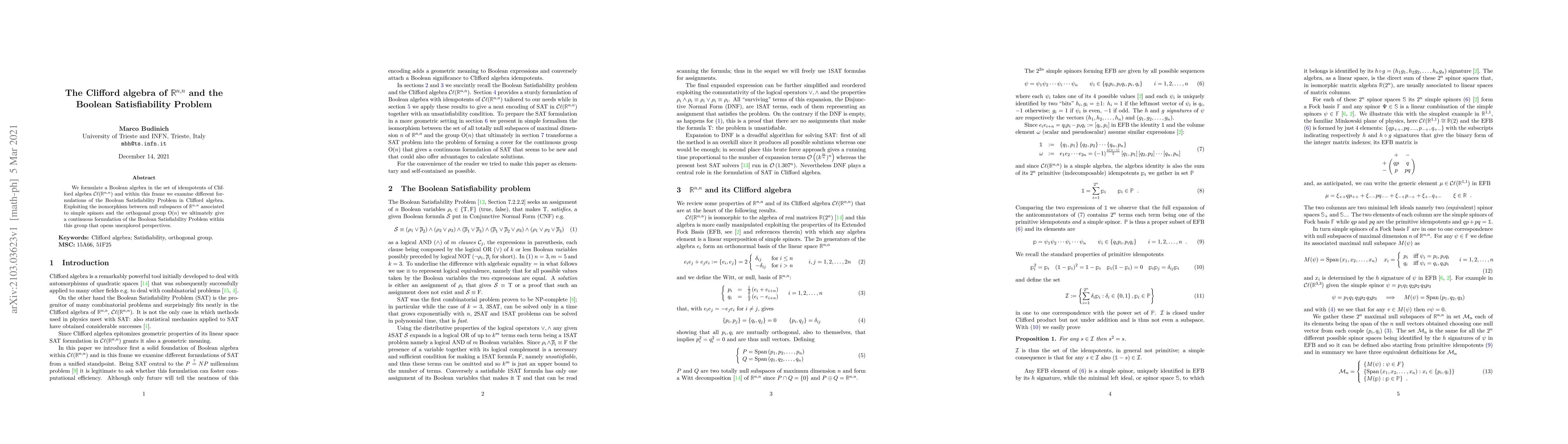 The paper constructs a Boolean algebra using idempotents in Clifford algebra Cl($R^{n,n}$) and explores the Boolean Satisfiability Problem (BSP) within this framework, ultimately linking null subspaces of $R^{n,n}$ to O(n) for a novel continuous BSP formulation.