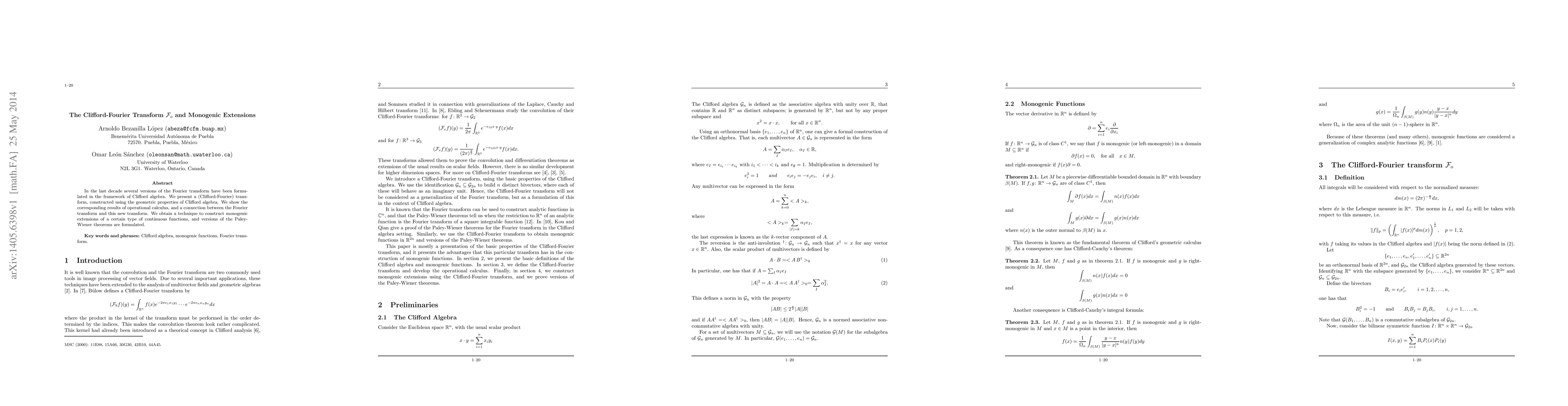 Several versions of the Fourier transform have been formulated in the framework of Clifford algebra. We present a (Clifford-Fourier) transform, constructed using the geometric properties of Clifford algebra. We show the corresponding results of operational calculus. We obtain a technique to construct monogenic extensions of a certain type of continuous functions, and versions of the Paley-Wiener theorems are formulated.
