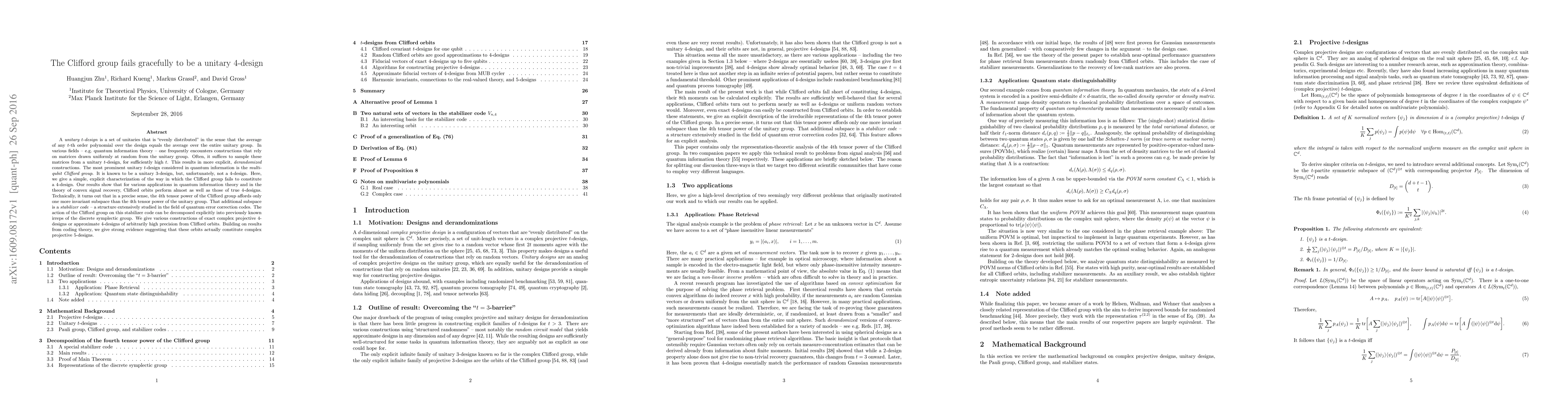 A unitary t-design is a set of unitaries that is "evenly distributed" in the sense that the average of any t-th order polynomial over the design equals the average over the entire unitary group. In various fields -- e.g. quantum information theory -- one frequently encounters constructions that rely on matrices drawn uniformly at random from the unitary group. Often, it suffices to sample these matrices from a unitary t-design, for sufficiently high t. This results in more explicit, derandomized constructions. The most prominent unitary t-design considered in quantum information is the multi-qubit Clifford group. It is known to be a unitary 3-design, but, unfortunately, not a 4-design. Here, we give a simple, explicit characterization of the way in which the Clifford group fails to constitute a 4-design. Our results show that for various applications in quantum information theory and in the theory of convex signal recovery, Clifford orbits perform almost as well as those of true 4-designs. Technically, it turns out that in a precise sense, the 4th tensor power of the Clifford group affords only one more invariant subspace than the 4th tensor power of the unitary group. That additional subspace is a stabilizer code -- a structure extensively studied in the field of quantum error correction codes. The action of the Clifford group on this stabilizer code can be decomposed explicitly into previously known irreps of the discrete symplectic group. We give various constructions of exact complex projective 4-designs or approximate 4-designs of arbitrarily high precision from Clifford orbits. Building on results from coding theory, we give strong evidence suggesting that these orbits actually constitute complex projective 5-designs.
