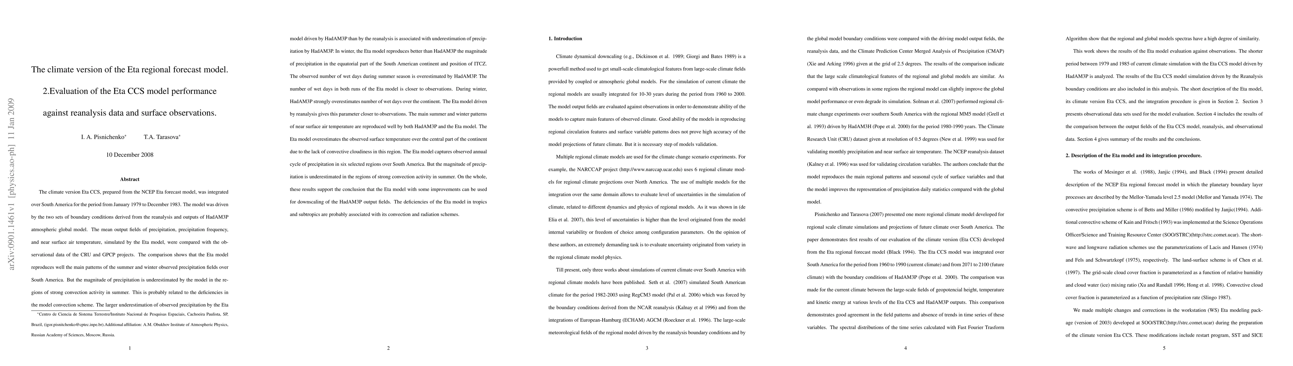 The Eta CCS model, derived from the NCEP Eta forecast model, was evaluated over South America from 1979 to 1983, showing good reproduction of precipitation and temperature patterns but underestimating summer precipitation magnitude, especially when driven by HadAM3P. The model's performance suggests potential for downscaling global model outputs with some improvements.