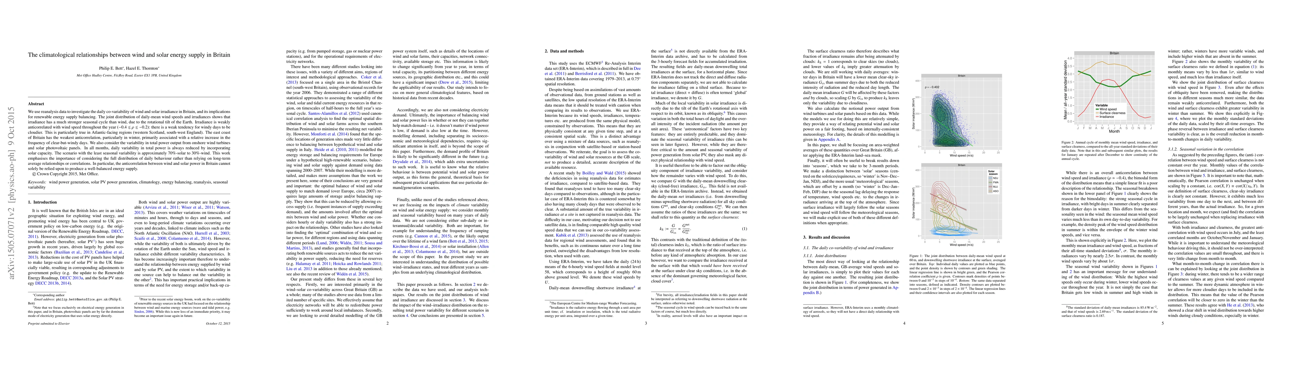 This study examines the daily co-variability of wind and solar energy in Britain, revealing that solar irradiance has a stronger seasonal cycle than wind, with a weak anticorrelation between wind speed and irradiance. Incorporating solar capacity reduces daily variability in total power output, suggesting a balanced energy supply requires a mix of 70% solar and 30% wind.