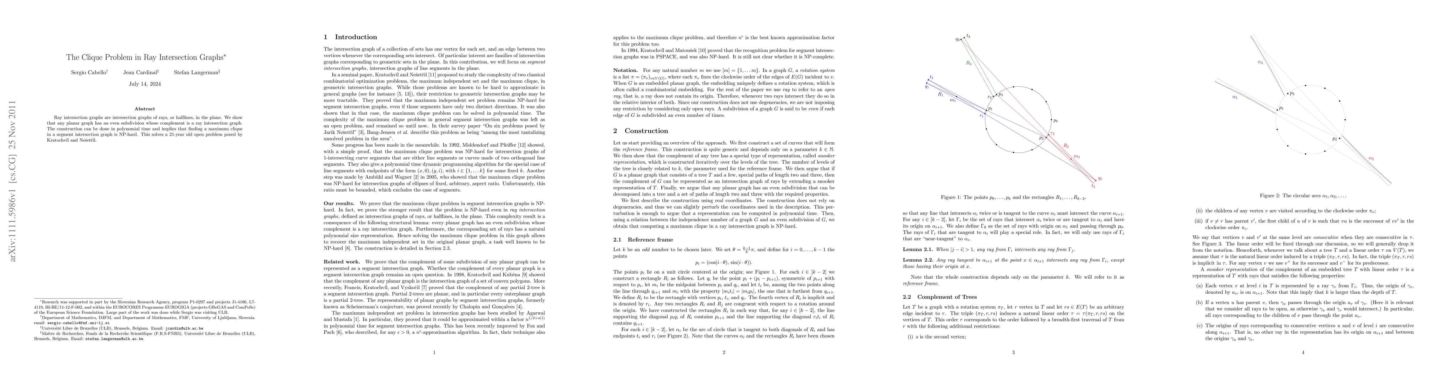The paper demonstrates a polynomial-time method to transform any planar graph into an even subdivision whose complement is a ray intersection graph, proving that finding a maximum clique in such graphs is NP-hard, thus resolving a 21-year-old open problem.