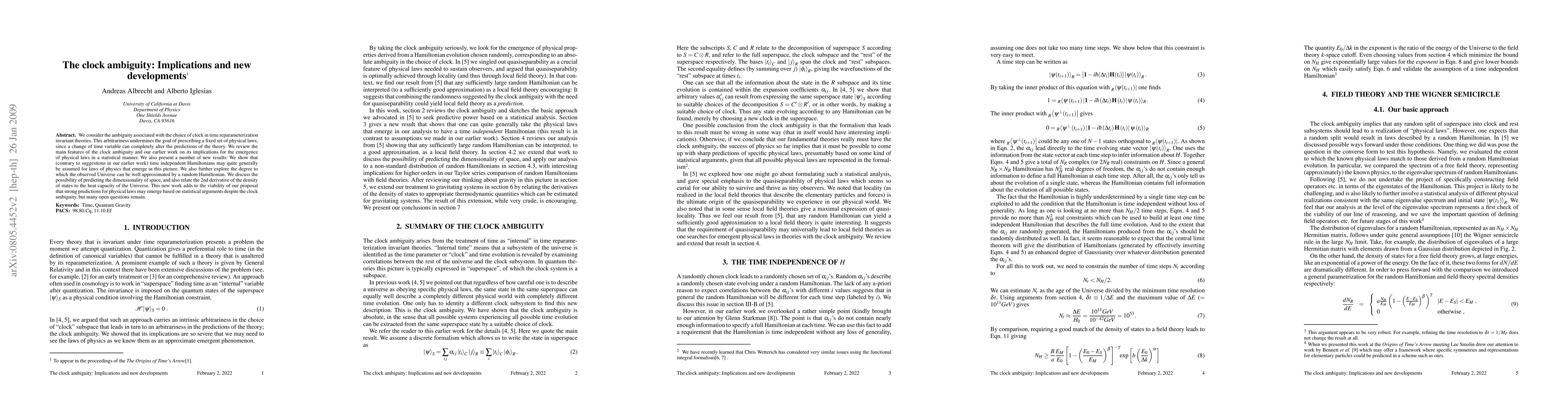 We consider the ambiguity associated with the choice of clock in time reparameterization invariant theories. This arbitrariness undermines the goal of prescribing a fixed set of physical laws, since a change of time variable can completely alter the predictions of the theory. We review the main features of the clock ambiguity and our earlier work on its implications for the emergence of physical laws in a statistical manner. We also present a number of new results: We show that (contrary to suggestions in our earlier work) time independent Hamiltonians may quite generally be assumed for laws of physics that emerge in this picture. We also further explore the degree to which the observed Universe can be well approximated by a random Hamiltonian. We discuss the possibility of predicting the dimensionality of space, and also relate the 2nd derivative of the density of states to the heat capacity of the Universe. This new work adds to the viability of our proposal that strong predictions for physical laws may emerge based on statistical arguments despite the clock ambiguity, but many open questions remain.