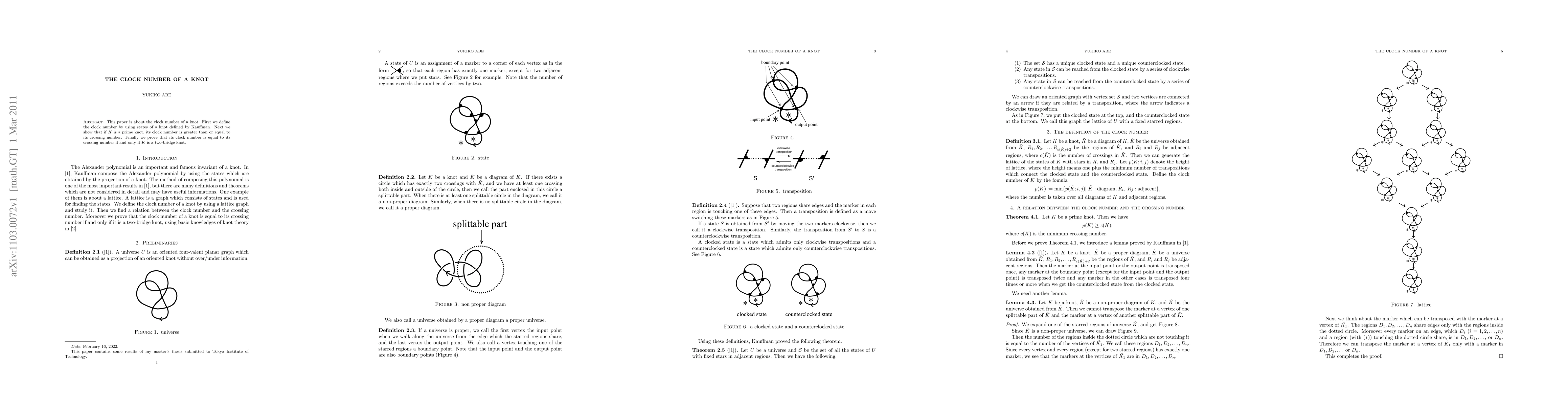 This paper defines the clock number of a knot using Kauffman's knot states and demonstrates that for prime knots, the clock number is at least as large as the crossing number. It concludes by proving that a prime knot's clock number equals its crossing number if and only if it is a two-bridge knot.
