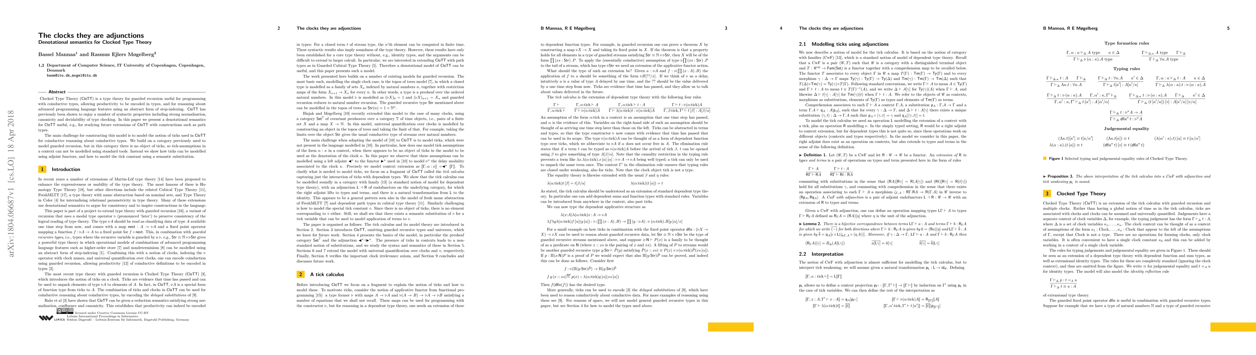 This paper presents a denotational semantics for Clocked Type Theory (CloTT), focusing on modeling its ticks for coinductive reasoning. It introduces adjoint functors to represent ticks, overcoming the absence of a tick object in the existing category model for guarded recursion.