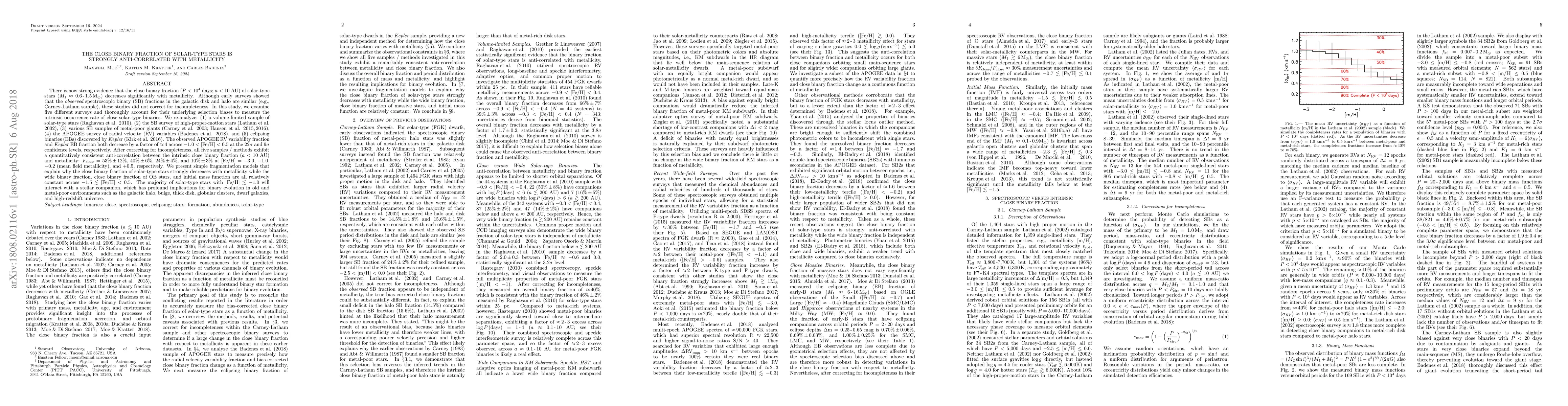 There is now strong evidence that the close binary fraction (P < 10$^4$ days; a < 10 AU) of solar-type stars ($M_1$ = 0.6-1.5M$_{\odot}$) decreases significantly with metallicity. Although early surveys showed that the observed spectroscopic binary (SB) fractions in the galactic disk and halo are similar (e.g., Carney-Latham sample), these studies did not correct for incompleteness. In this study, we examine five different surveys and thoroughly account for their underlying selection biases to measure the intrinsic occurrence rate of close solar-type binaries. We re-analyze: (1) a volume-limited sample of solar-type stars, (2) an SB survey of high-proper-motion stars, (3) various SB samples of metal-poor giants, (4) the APOGEE survey of radial velocity (RV) variables, and (5) Kepler eclipsing binaries (EBs). The observed APOGEE RV variability fraction and Kepler EB fraction both decrease by a factor of $\approx$4 across $-$1.0 < [Fe/H] < 0.5 at the 22$\sigma$ and 9$\sigma$ confidence levels, respectively. After correcting for incompleteness, all five samples exhibit a quantitatively consistent anti-correlation between the intrinsic close binary fraction (a < 10 AU) and metallicity: $F_{\rm close}$ = 53%$\pm$12%, 40%$\pm$6%, 24%$\pm$4%, and 10%$\pm$3% at [Fe/H] = $-$3.0, $-$1.0, $-$0.2 (mean field metallicity), and +0.5, respectively. We present fragmentation models that explain why the close binary fraction of solar-type stars strongly decreases with metallicity while the wide binary fraction, close binary fraction of OB stars, and initial mass function are all constant across $-$1.5 < [Fe/H] < 0.5. The majority of solar-type stars with [Fe/H] < $-$1.0 will interact with a stellar companion, which has profound implications for binary evolution in old and metal-poor environments such as the galactic halo, bulge, thick disk, globular clusters, dwarf galaxies, and high-redshift universe.