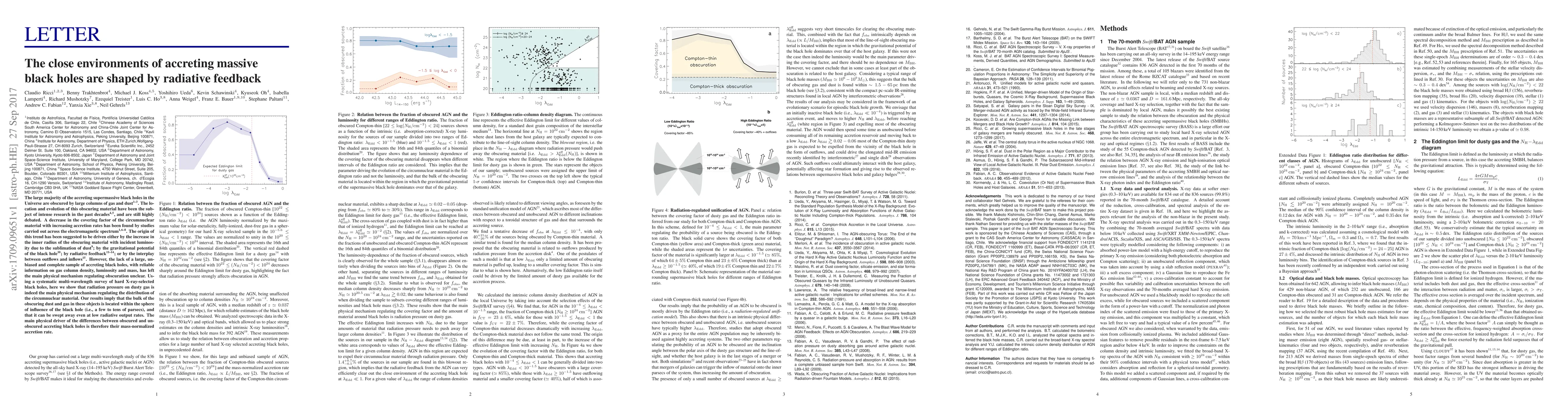 The large majority of the accreting supermassive black holes in the Universe are obscured by large columns of gas and dust. The location and evolution of this obscuring material have been the subject of intense research in the past decades, and are still highly debated. A decrease in the covering factor of the circumnuclear material with increasing accretion rates has been found by studies carried out across the electromagnetic spectrum. The origin of this trend has been suggested to be driven either by the increase in the inner radius of the obscuring material with incident luminosity due to the sublimation of dust; by the gravitational potential of the black hole; by radiative feedback; or by the interplay between outflows and inflows. However, the lack of a large, unbiased and complete sample of accreting black holes, with reliable information on gas column density, luminosity and mass, has left the main physical mechanism regulating obscuration unclear. Using a systematic multi-wavelength survey of hard X-ray-selected black holes, here we show that radiation pressure on dusty gas is indeed the main physical mechanism regulating the distribution of the circumnuclear material. Our results imply that the bulk of the obscuring dust and gas in these objects is located within the sphere of influence of the black hole (i.e., a few to tens of parsecs), and that it can be swept away even at low radiative output rates. The main physical driver of the differences between obscured and unobscured accreting black holes is therefore their mass-normalized accretion rate.