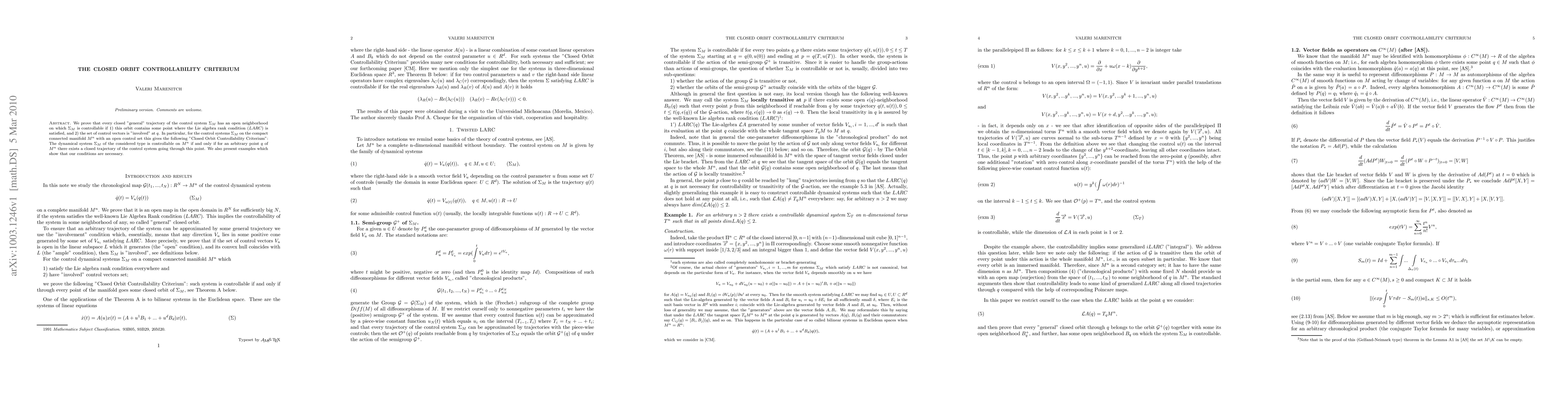 We prove that every closed "general" trajectory of the control system $\Sigma_M$ has an open neighborhood on which $\Sigma_M$ is controllable if 1) this orbit contains some point where the Lie algebra rank condition ($LARC$) is satisfied, and 2) the set of control vectors is "involved" at $q$. In particular, for the control systems $\Sigma_M$ on the compact connected manifold $M^n$ with an open control set this gives the following "Closed Orbit Controllability Criterium": The dynamical system $\Sigma_M$ of the considered type is controllable on $M^n$ if and only if for an arbitrary point $q$ of $M^n$ there exists a closed trajectory of the control system going through this point. We also present examples which show that our conditions are necessary.