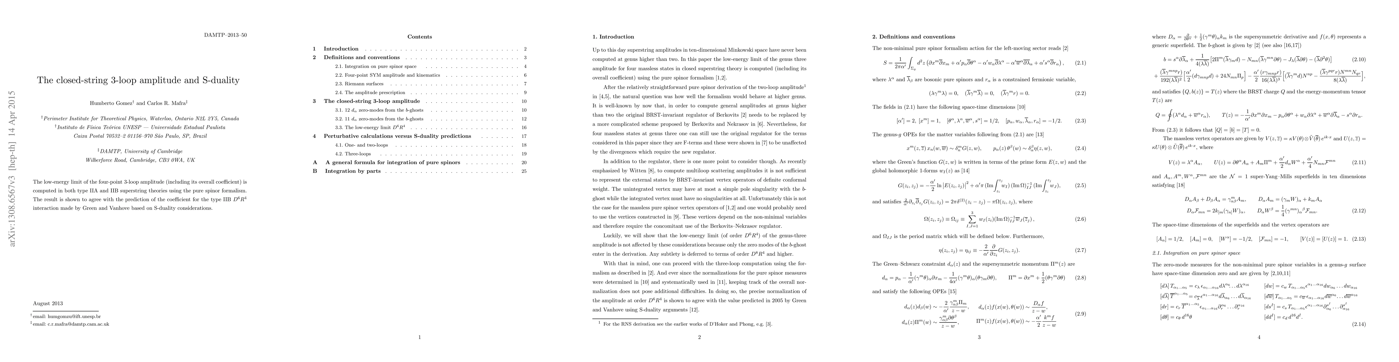 The low-energy limit of the four-point 3-loop amplitude (including its overall coefficient) is computed in both type IIA and IIB superstring theories using the pure spinor formalism. The result is shown to agree with the prediction of the coefficient for the type IIB $D^6 R^4$ interaction made by Green and Vanhove based on S-duality considerations.