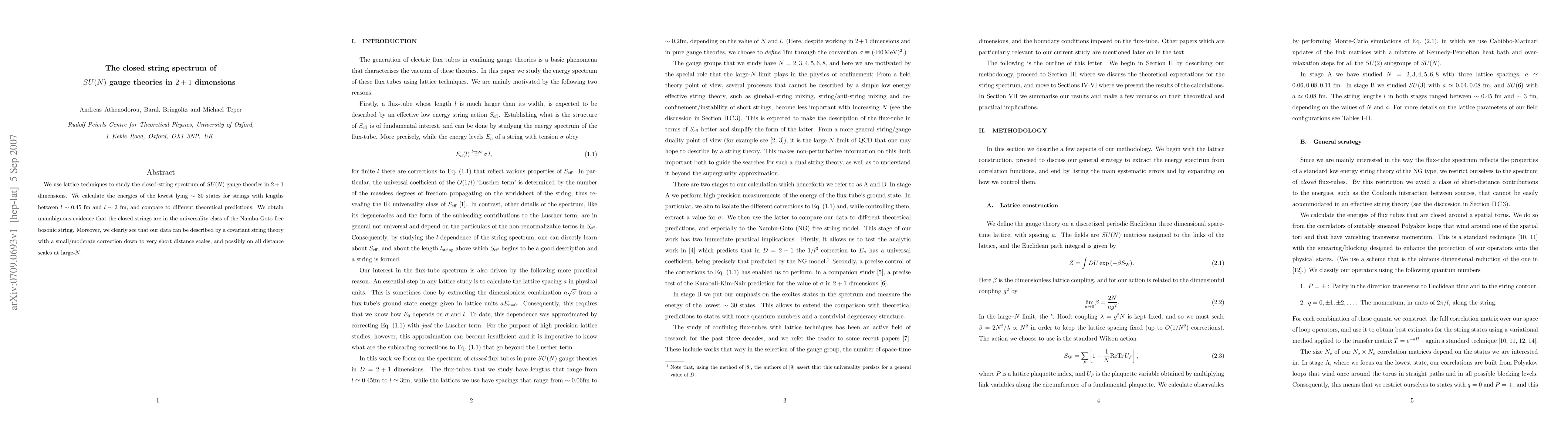 This paper employs lattice techniques to investigate the closed string spectrum in SU(N) gauge theories in 2+1 dimensions, finding that the lowest energy states align with the Nambu-Goto free bosonic string model. The study reveals that the data fits a covariant string theory with small corrections, suggesting applicability across all distance scales at large N.