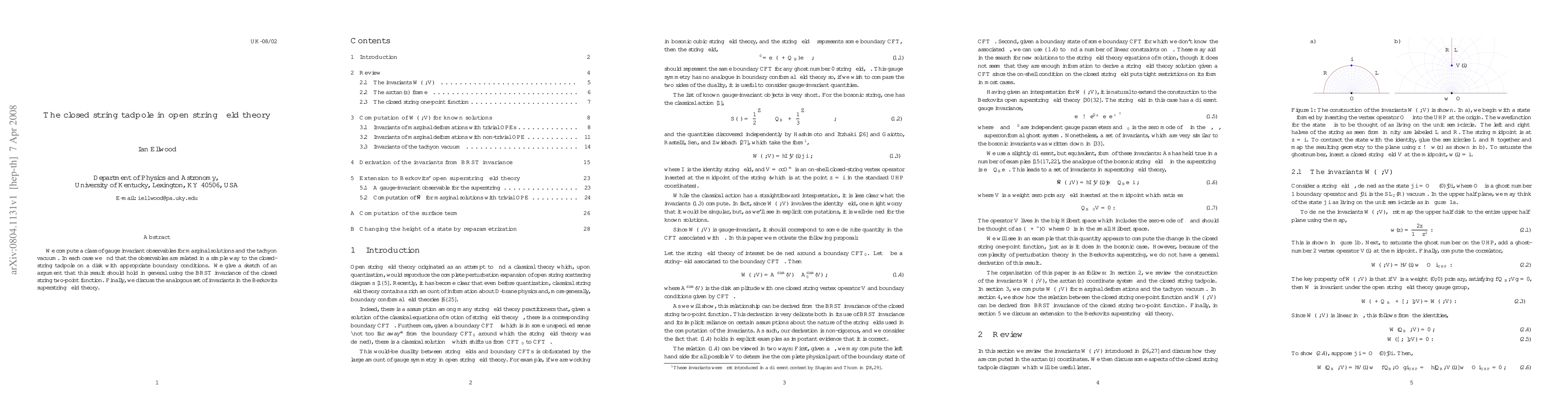 The research computes gauge invariant observables for marginal solutions and the tachyon vacuum in open string field theory, relating them to the closed-string tadpole on a disk with specific boundary conditions. The argument for this relation is sketched using BRST invariance of the closed string two-point function.
