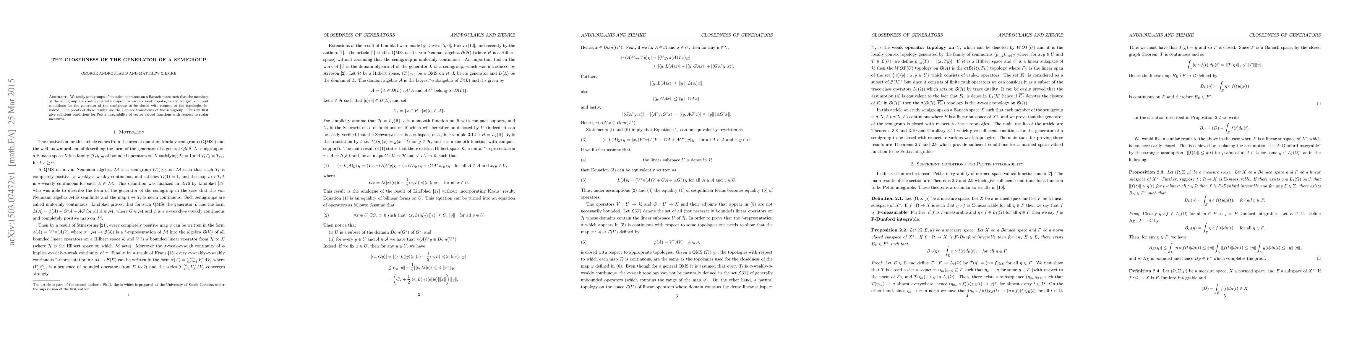 We study semigroups of bounded operators on a Banach space such that the members of the semigroup are continuous with respect to various weak topologies and we give sufficient conditions for the generator of the semigroup to be closed with respect to the topologies involved. The proofs of these results use the Laplace transforms of the semigroup. Thus we first give sufficient conditions for Pettis integrability of vector valued functions with respect to scalar measures.