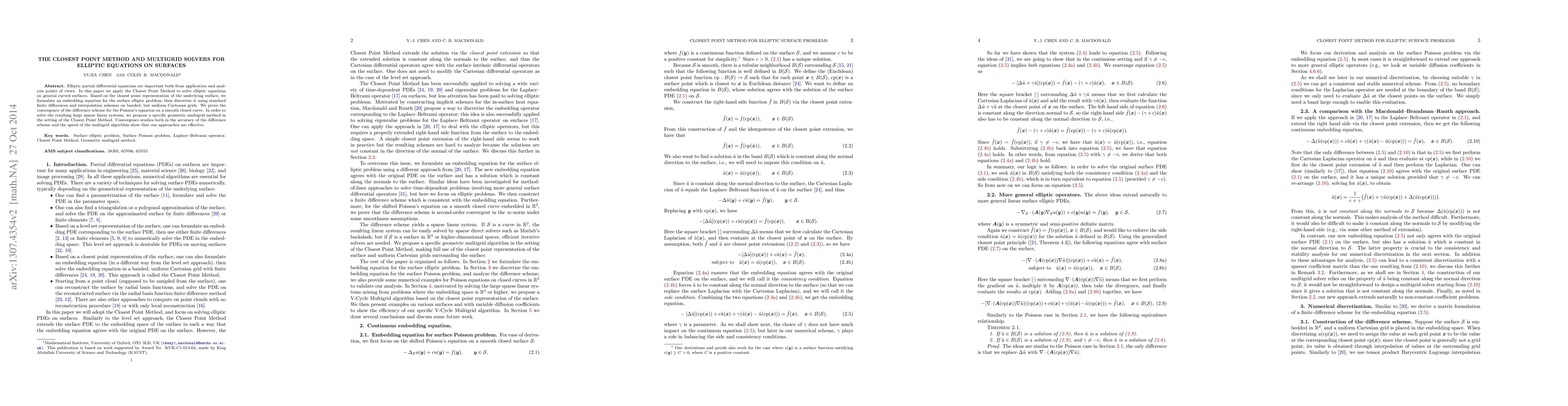 This paper applies the Closest Point Method to solve elliptic partial differential equations on curved surfaces by embedding the problem into a finite difference scheme on Cartesian grids. It proposes a geometric multigrid method to efficiently solve the resulting large sparse linear systems, demonstrating convergence and effectiveness through accuracy and speed studies.