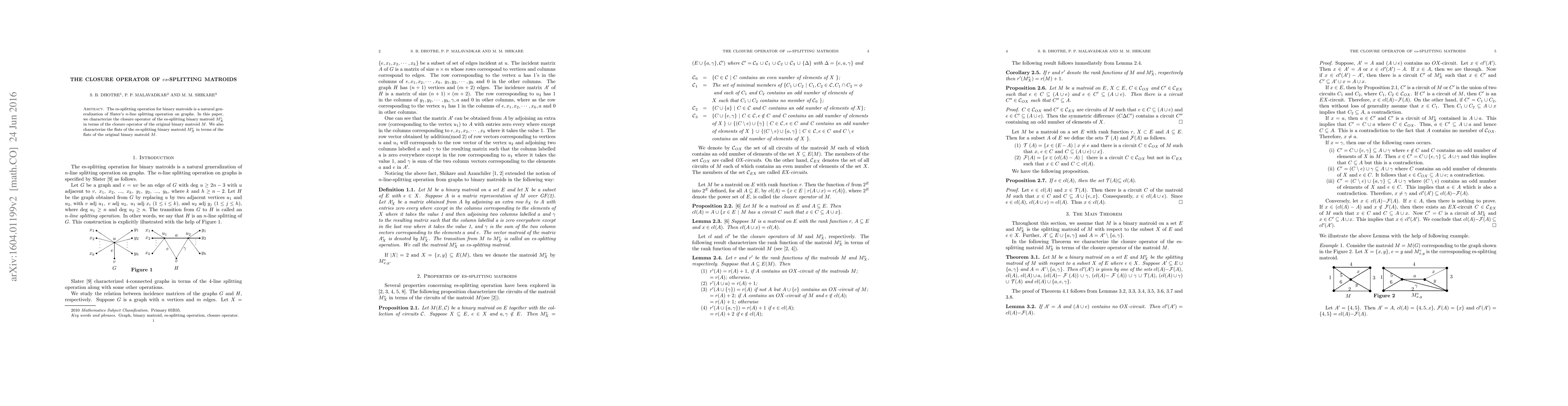 The paper characterizes the closure operator of es-splitting binary matroids $M^e_X$ in terms of the closure operator of the original binary matroid $M$, and also characterizes the flats of $M^e_X$ in terms of the flats of $M$.