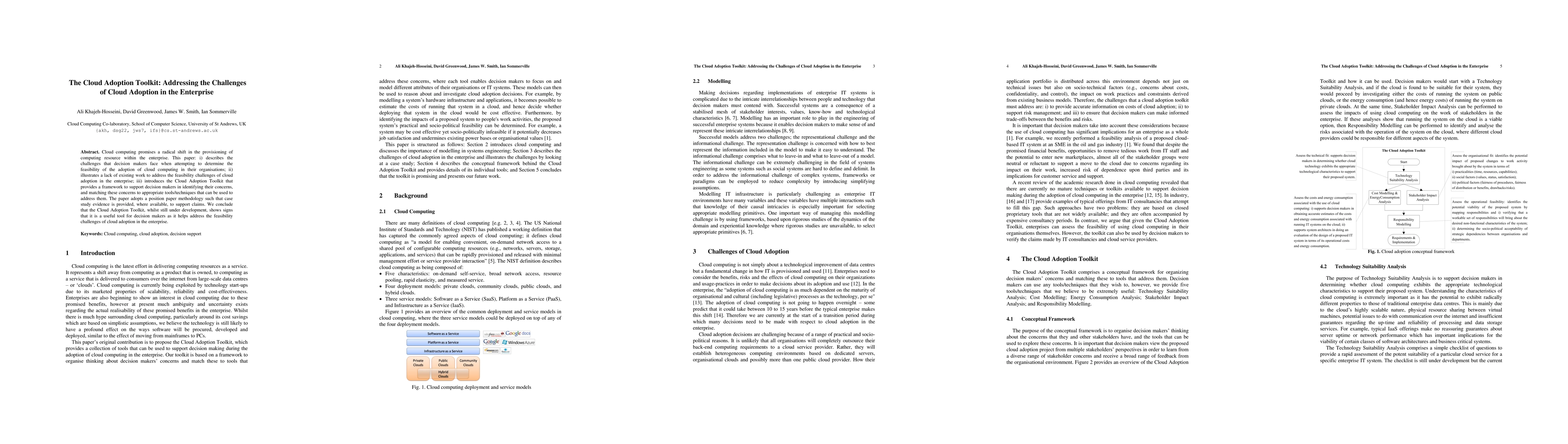 This paper outlines the challenges enterprises face in adopting cloud computing, highlights the lack of existing solutions, and introduces the Cloud Adoption Toolkit to help decision makers address these challenges. The toolkit provides a framework for identifying concerns and matching them with appropriate tools, supported by case study evidence.